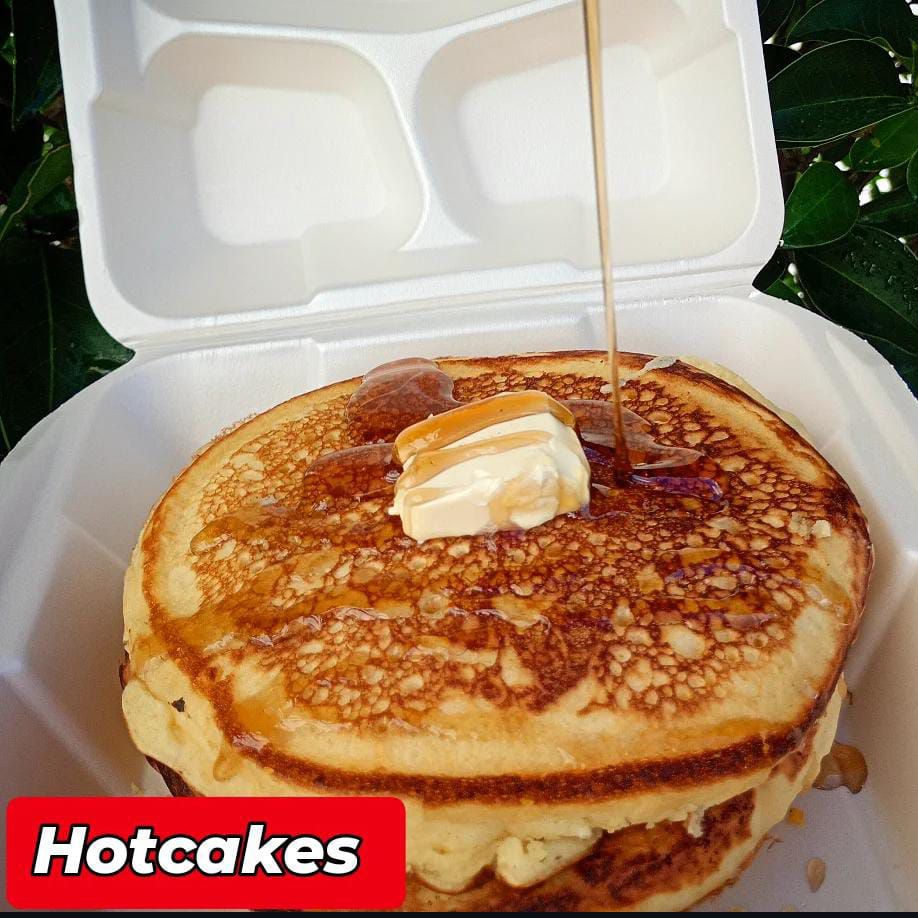 Tres piezas de hot cakes ,grandes y esponjositos, bañados con el sabor de tu preferencia