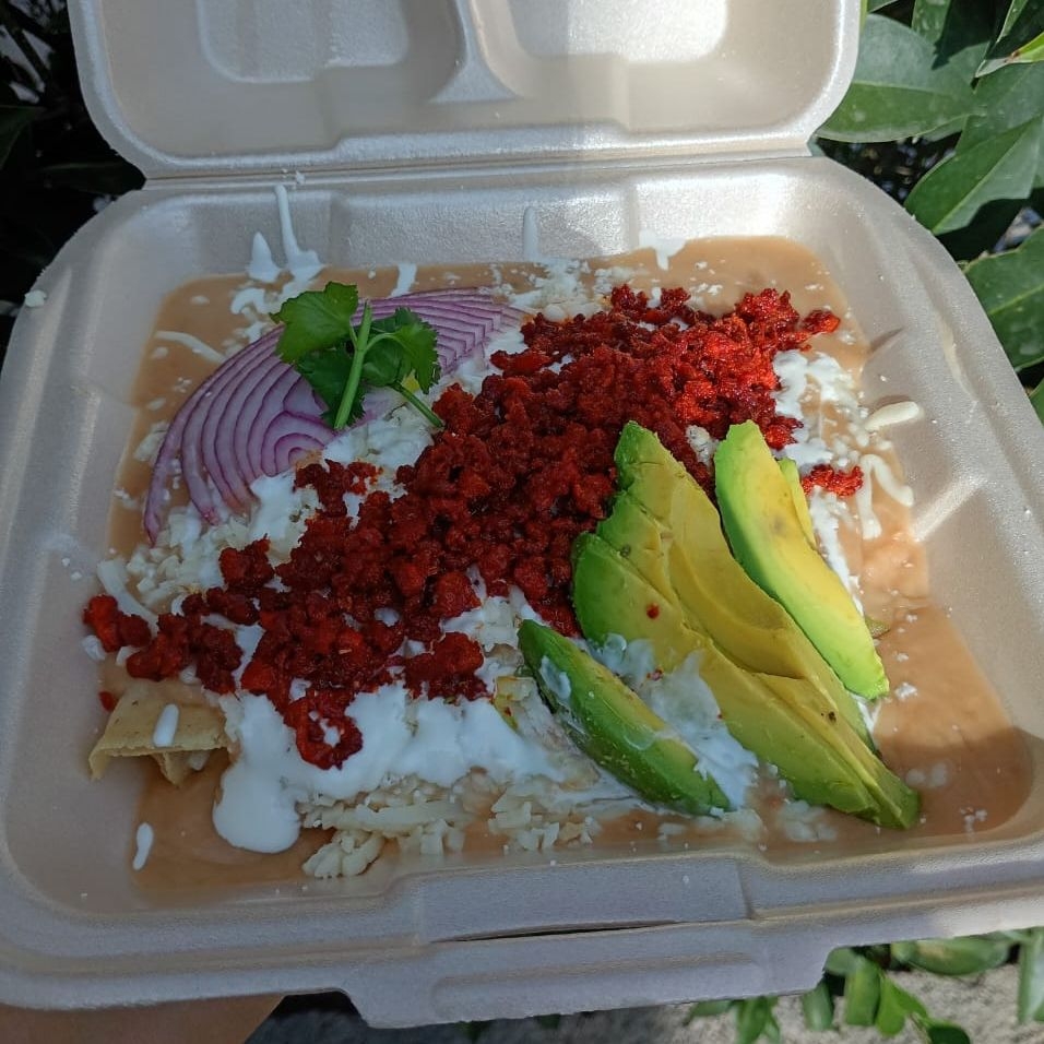 Totopos caseros bañados en salsa de tu preferencia poblana,suiza,chipotle,verde o roja,servidos con queso, crema y cebolla acompañados de bolillo ..
