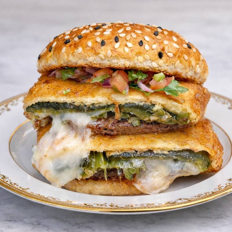 Hambuurguesa con: Carne, chile relleno de queso y caldillo de tomate.