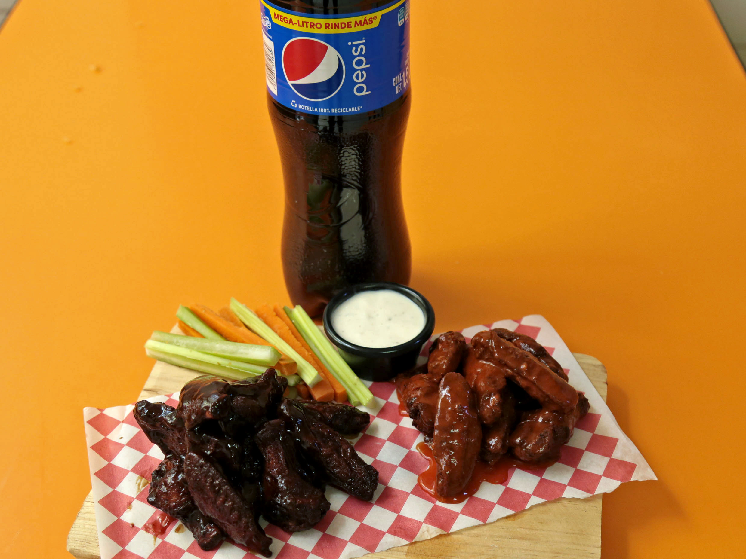 1 kg de alitas, 2 salsas a elegir, bastones de vegetales, aderezo y un refresco 1.5 lts de tu elección