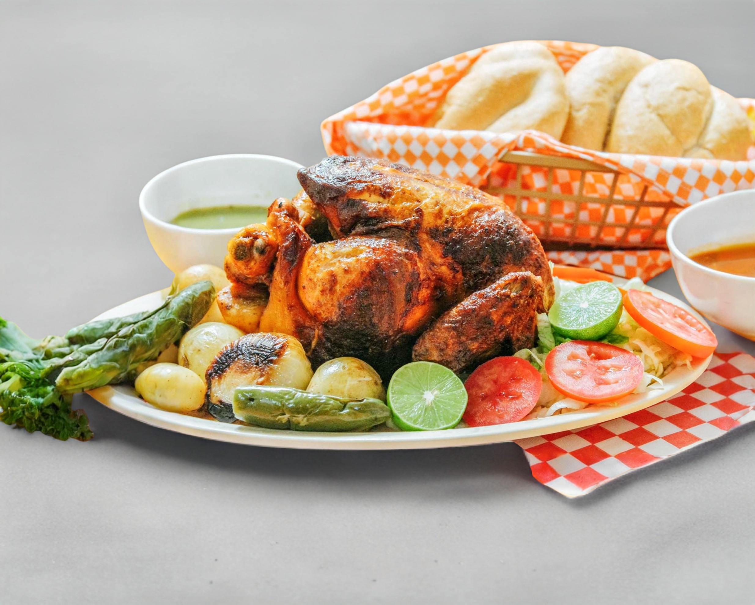 Incluye un pollo rostizado, 2 salsas, 1 ensalada y 2 bolillos.