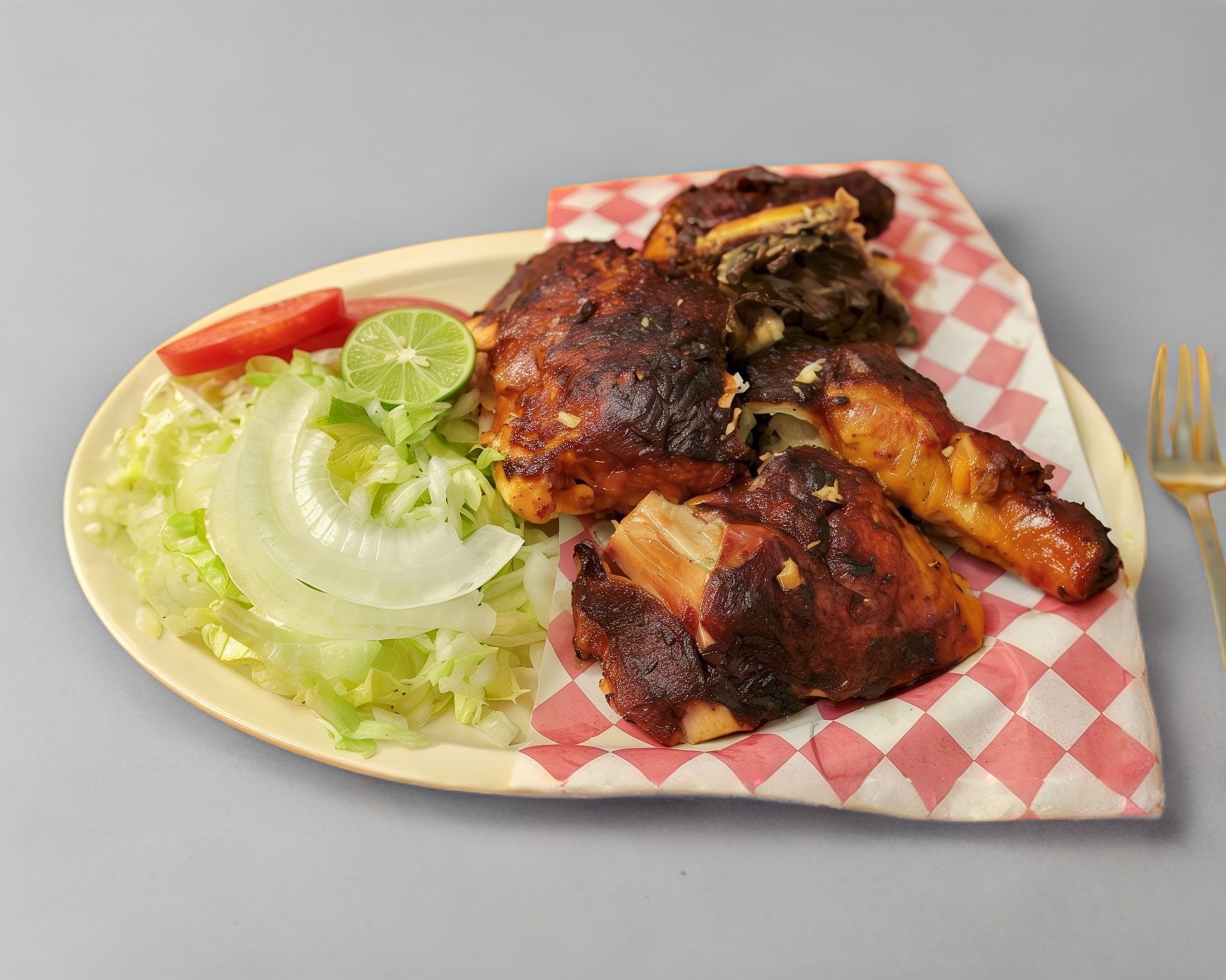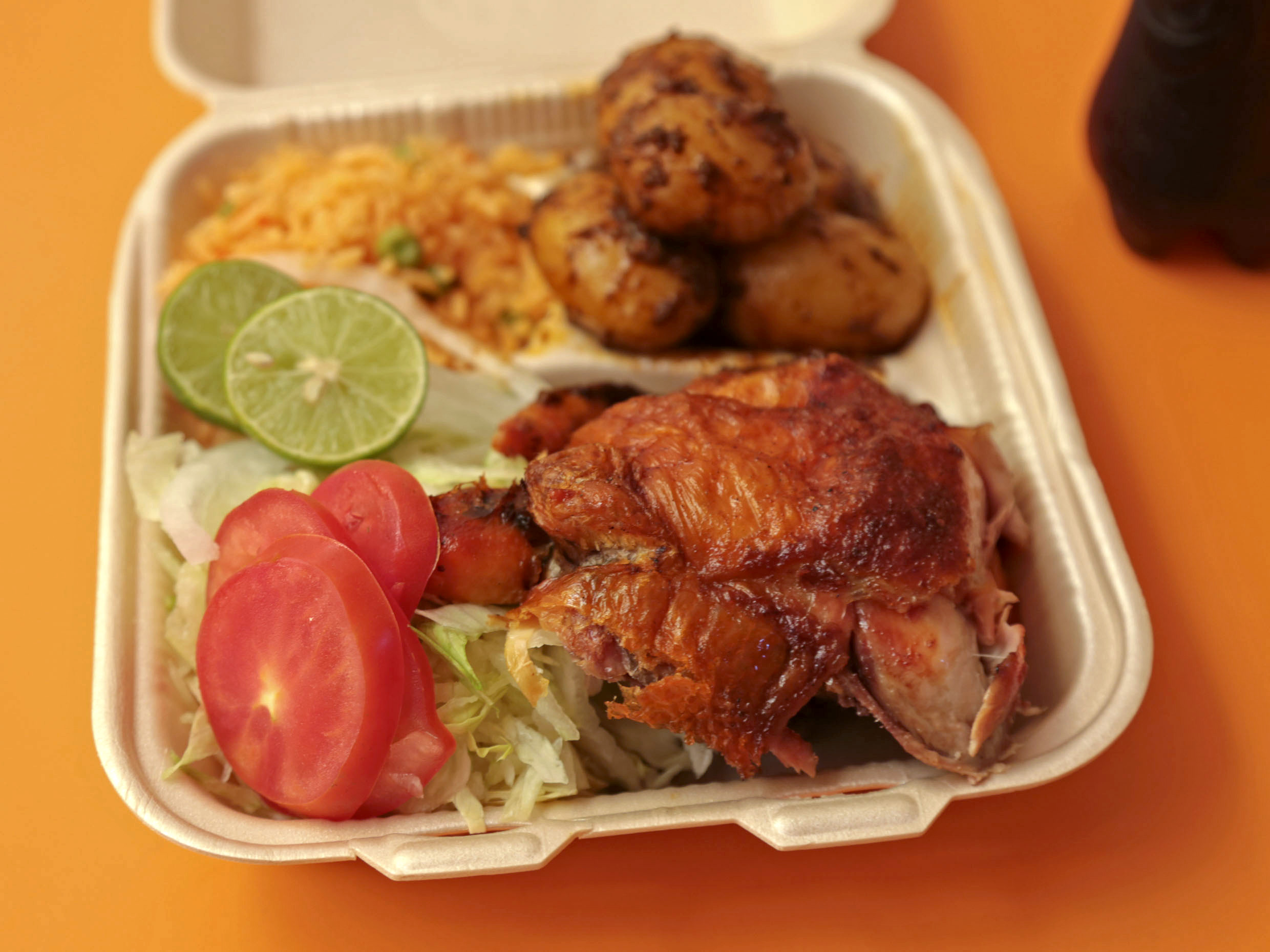 Un cuarto de pollo, 1 salsa, 1 ensalada y 1 bolillo.