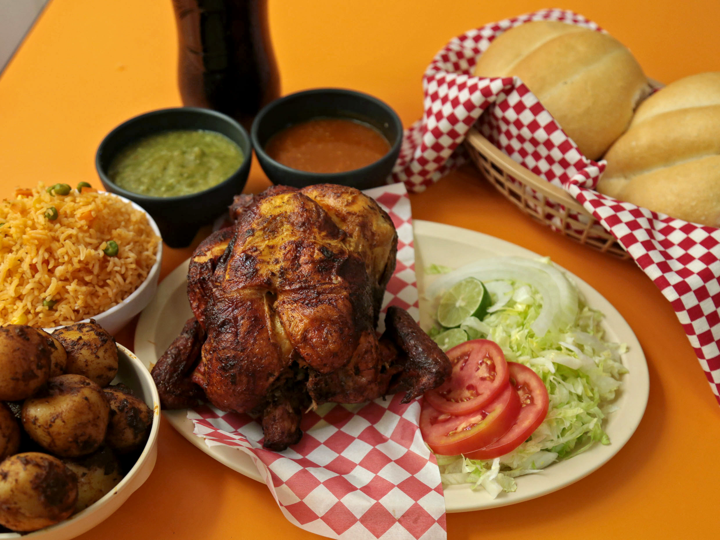 2 pollos rostizados grandes, 4 salsas a elegir, 4 bolillos, 2 ensaladas,1 litro de arroz, medio litro de mole poblano y 1 refresco de 1.5 lts.