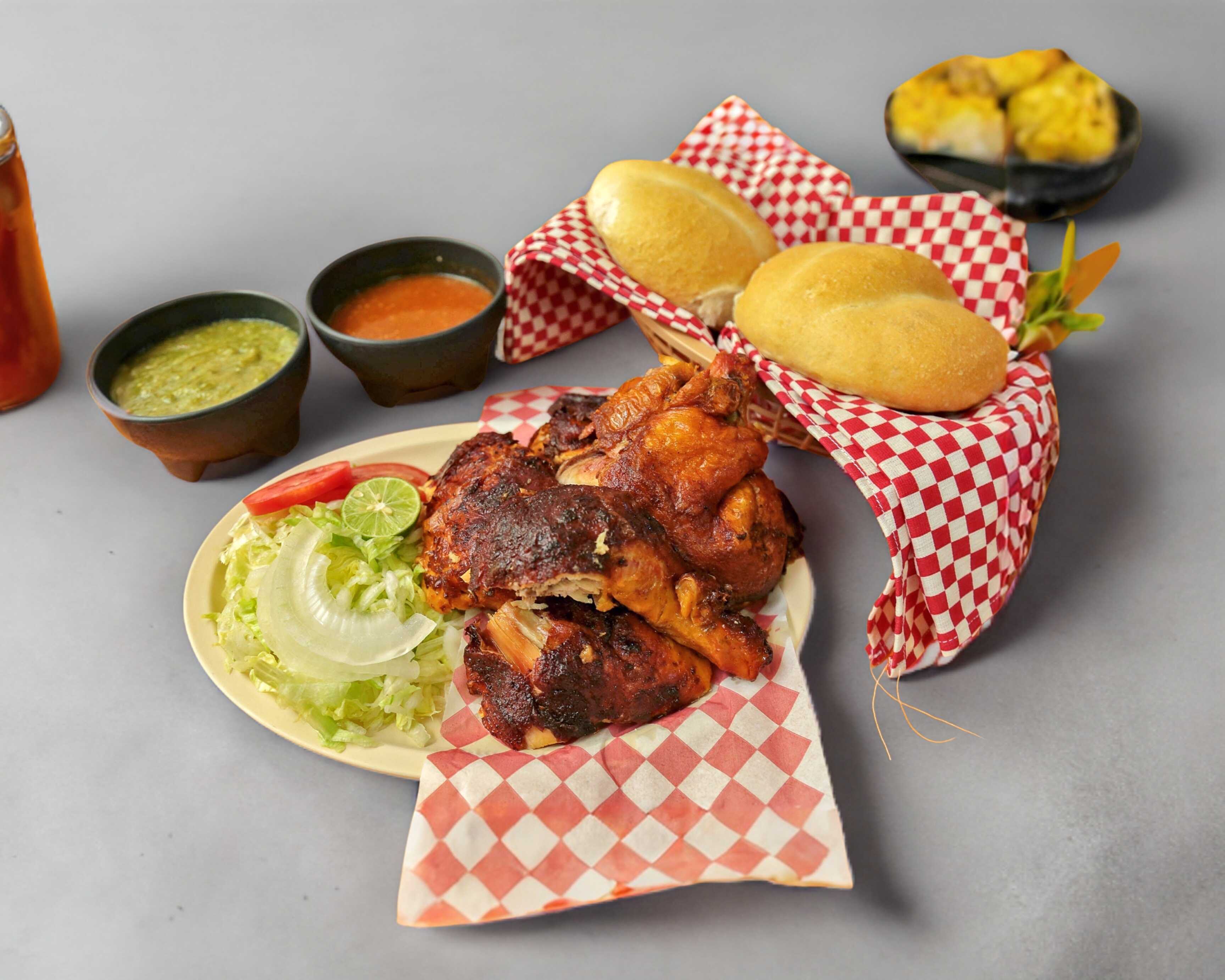 Incluye 3/4 de pollo rostizado, 2 salsas, 1 ensalada y 2 bolillos.