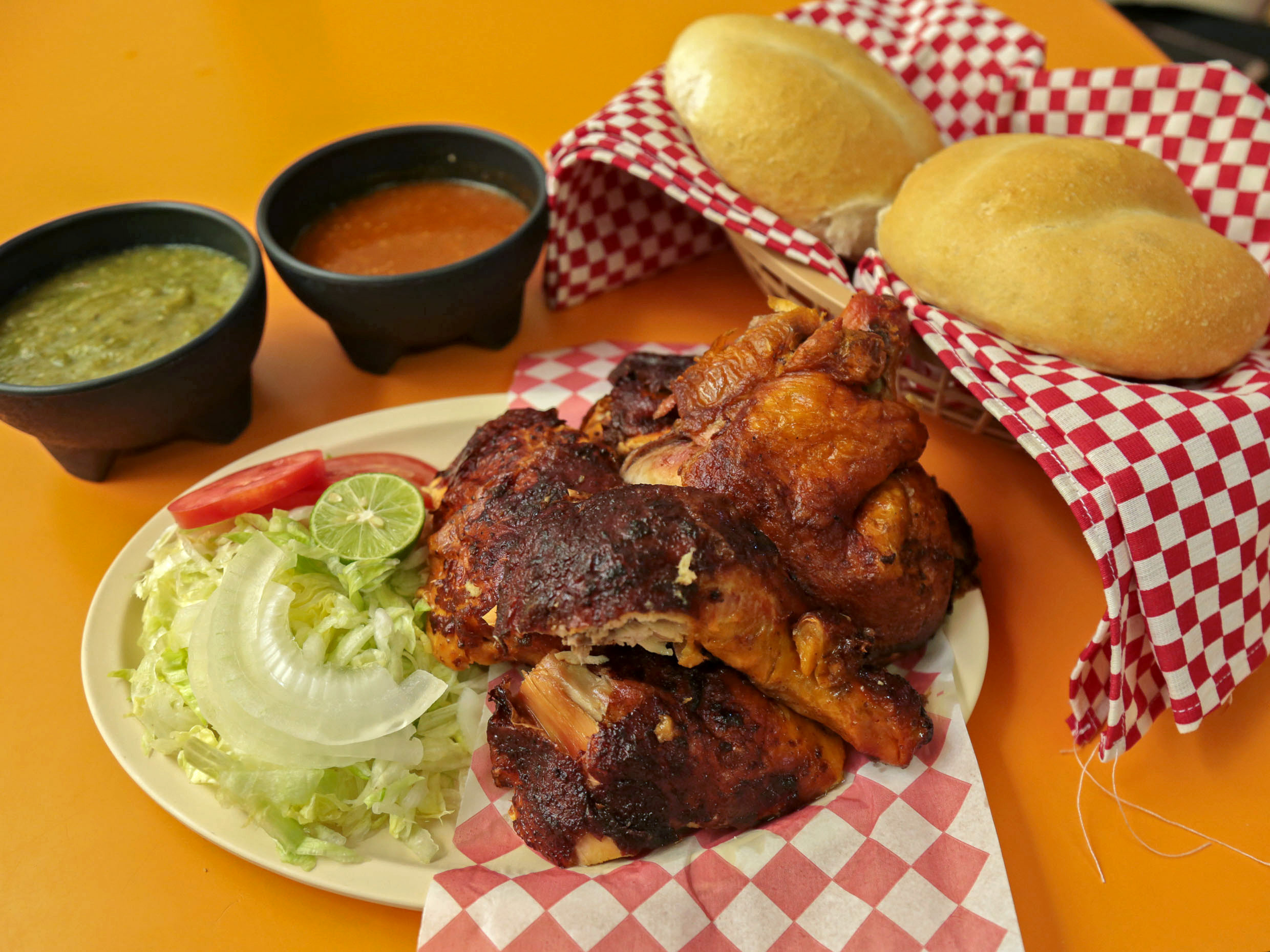2 Pollos rostizados grandes, 1 litro de arroz, medio litro de mole poblano, 1 refresco de litro y medio, 4 salsas, 4 bolillos y 2 ensaladas.