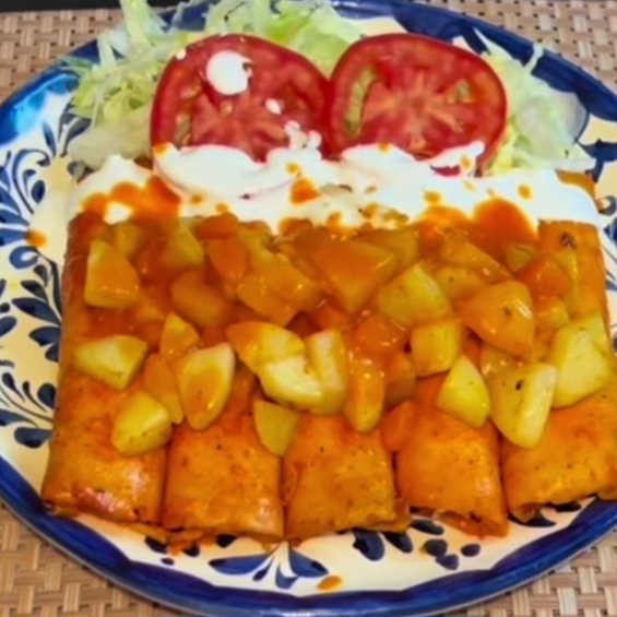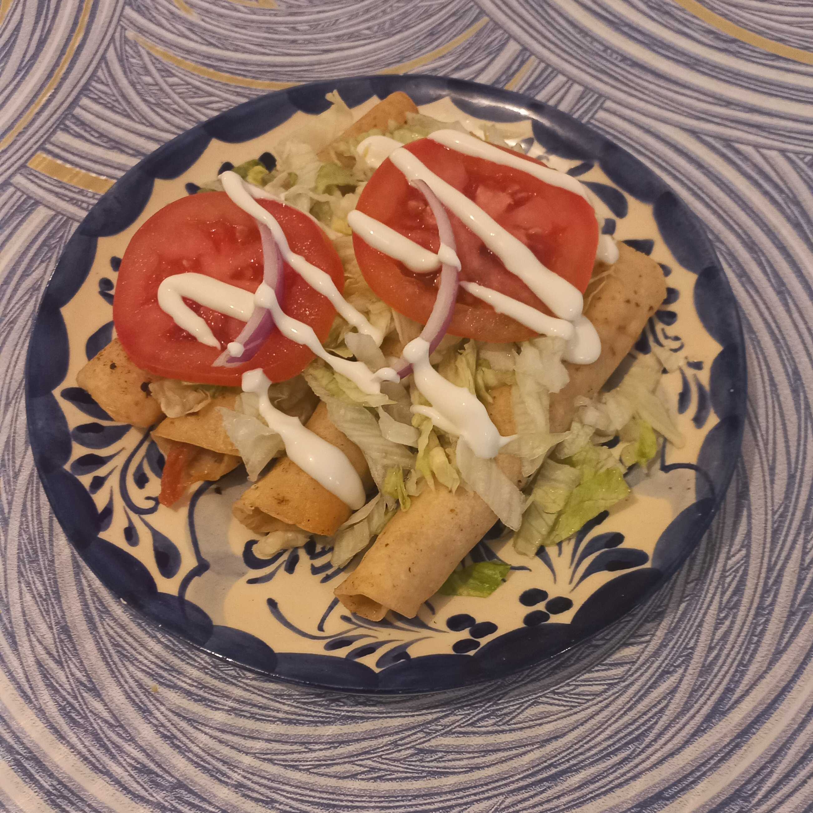 Flautas de pollo con lechuga, queso, crema y salsa.