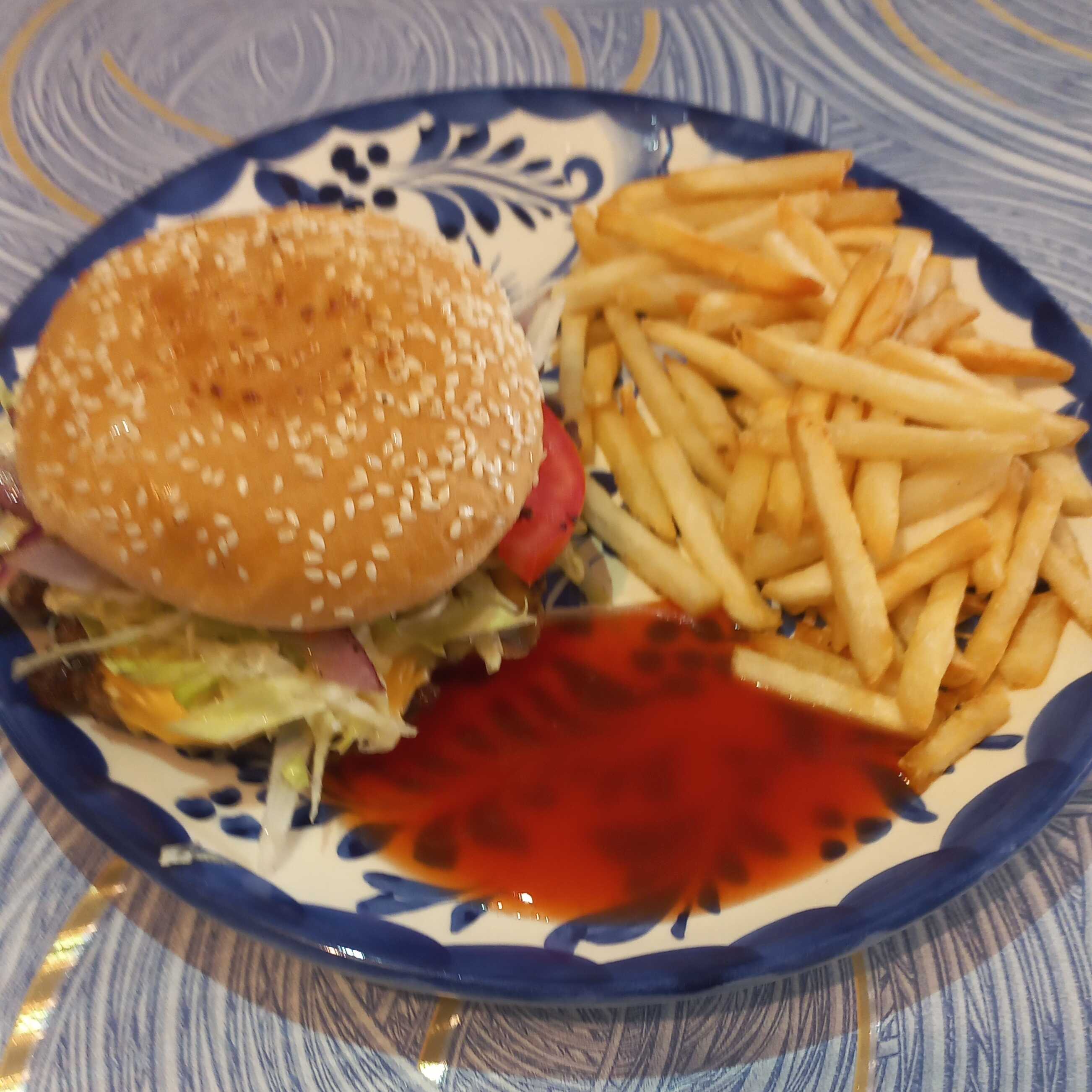 Carne de res con queso amarillo, lechuga, jitomate, aguacate y aderezos.
