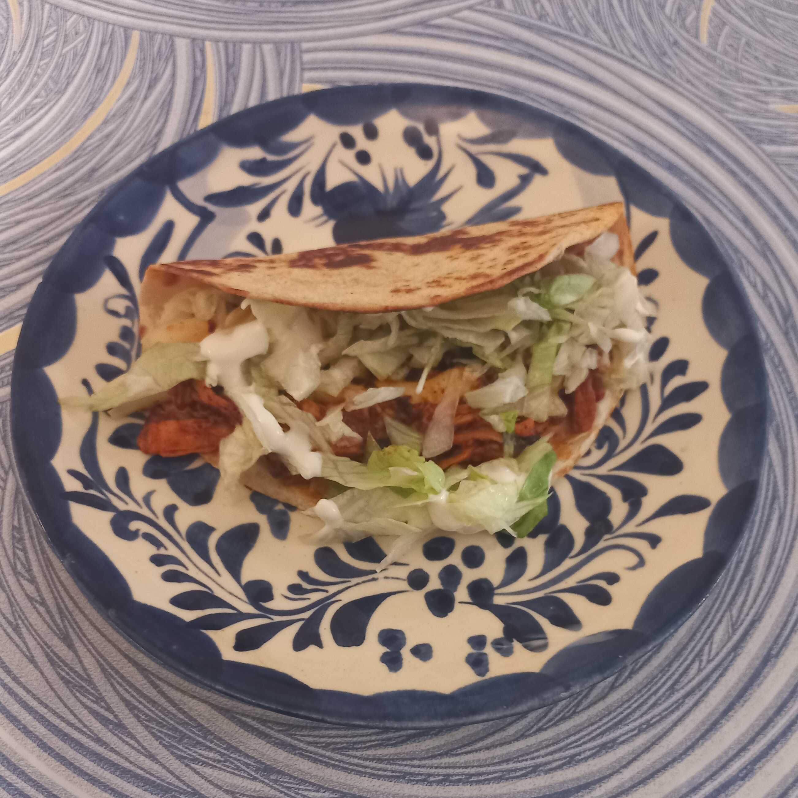 Burritos de pollo adobado con lechuga, crema y catsup.