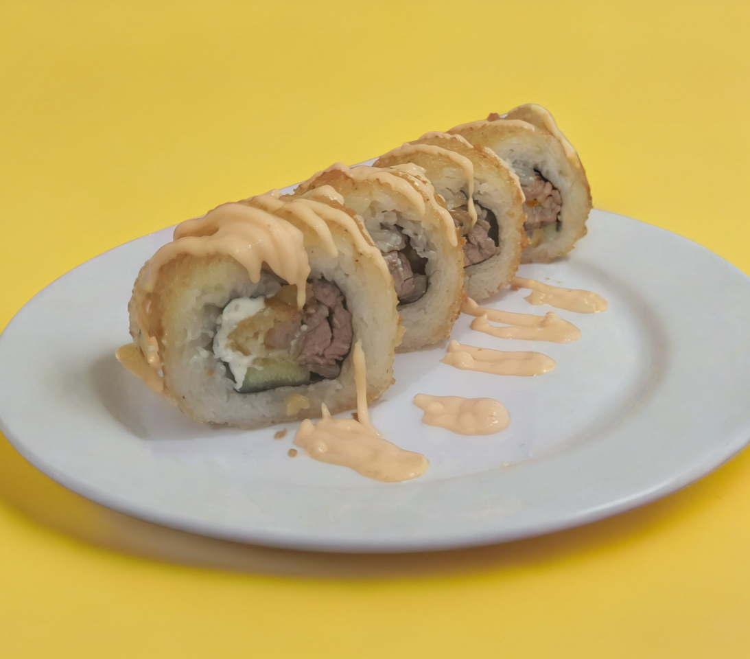carne de res, camarones empanizados, queso crema y aguacate con salsa sakura