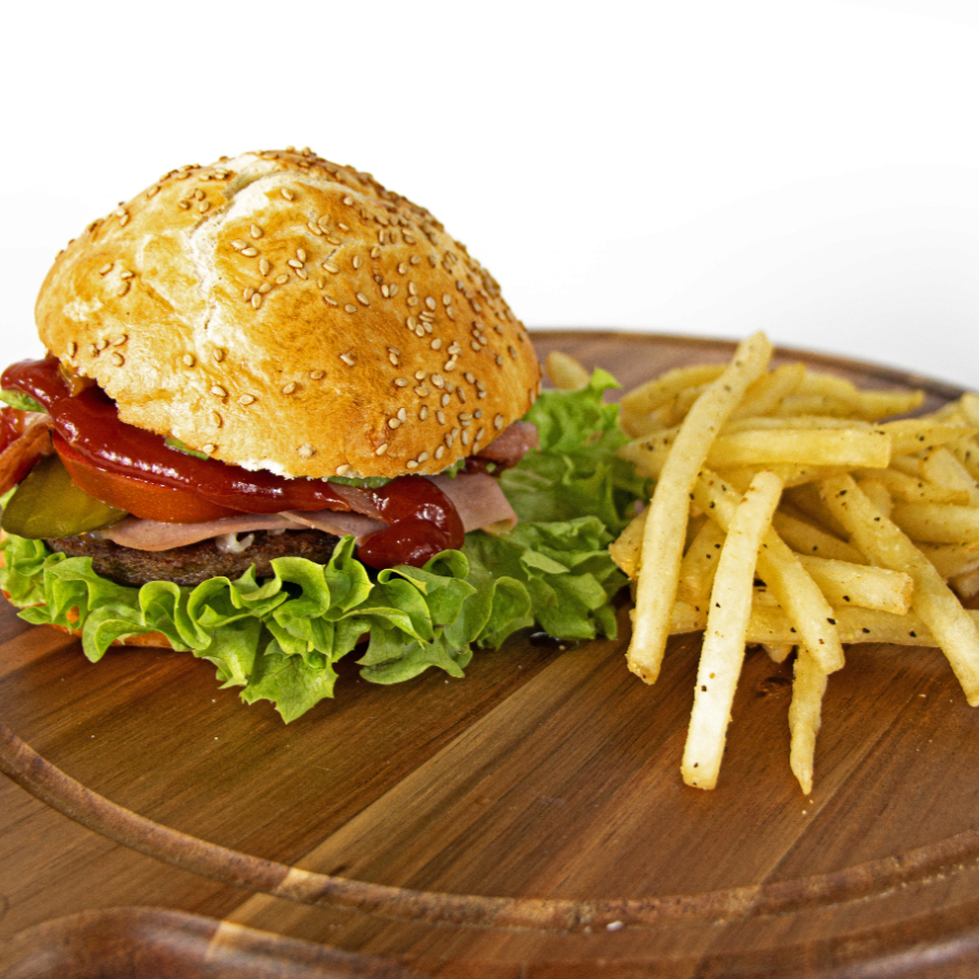 Jugosa carne de res con tocino y salsa preparada acompañadas de lechuga jitomate cebolla morada queso asadero chiles jalapeños tocino y 100 g de papas a la francesa gajo con costo adicional.
