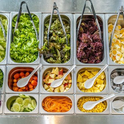 Lechuga, 150 g proteína, 3 porciones o 6 medias porciones de barra fría, 2 toppings y 2 aderezos de 2 oz.