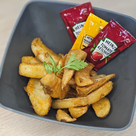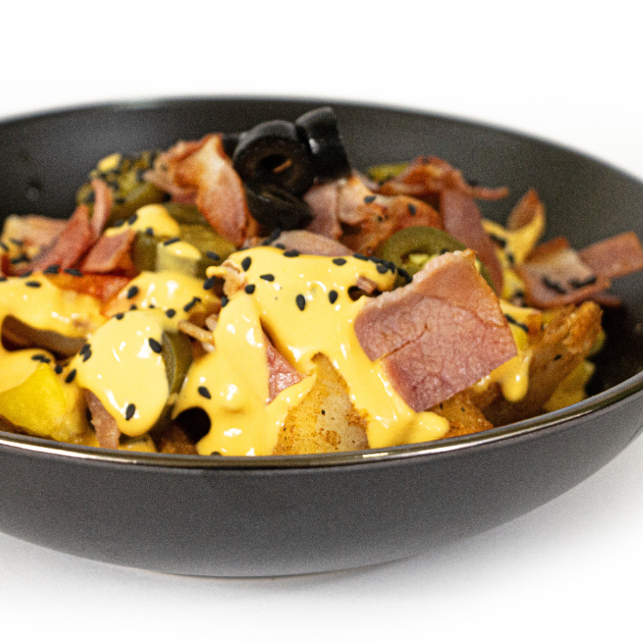 Riquísimo boneless bañados en tu salsa preferida acompañada de lechuga jitomate cebolla morada queso asadero chiles jalapeños tocino y 100 g de papas a la francesa gajo con costo adicional.
