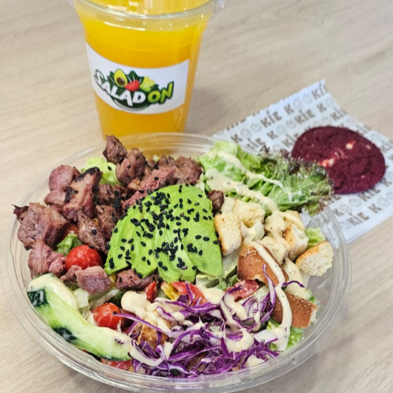 Lechuga, 150 g proteína, 3 porciones o 6 medias porciones de barra fría, 2 toppings y 2 aderezos de 2 oz incluye una bebida y una galleta Kookie.