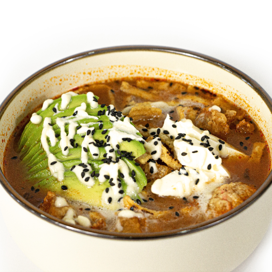 Deliciosa base de caldo de pollo con tomate con tiritas de tortilla chicharrón botanero súper crujiente queso panela crema natural y aguacate. ( ¿DESEAS AÑADIR GARBANZO?)