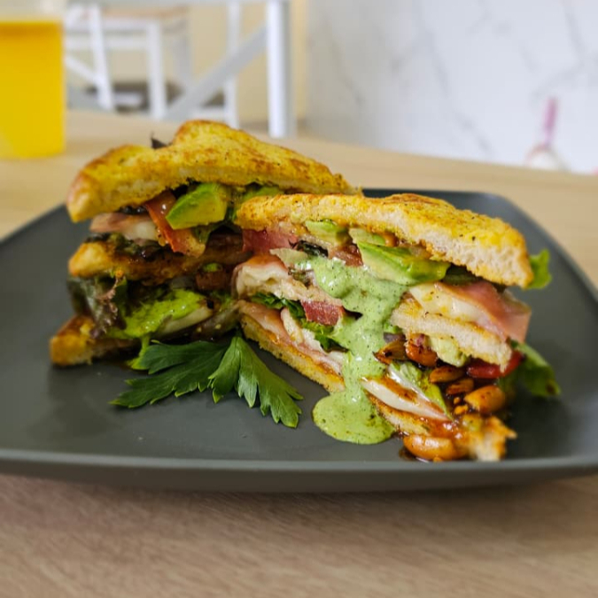 Dos deliciosas piezas de pan de masa madre tostado con huevo estrellado y abanico de aguacate con topping de salsa macha y germen de soya.