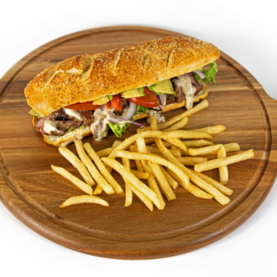 Pan con ajo y salvado de trigo natural o tostado con lechuga jitomate salsana (salsa cremosa a las finas hierbas y ajo) crotones a las finas hierbas o tiras de tortilla y cebolla morada incluye porción de papas a la francesa.