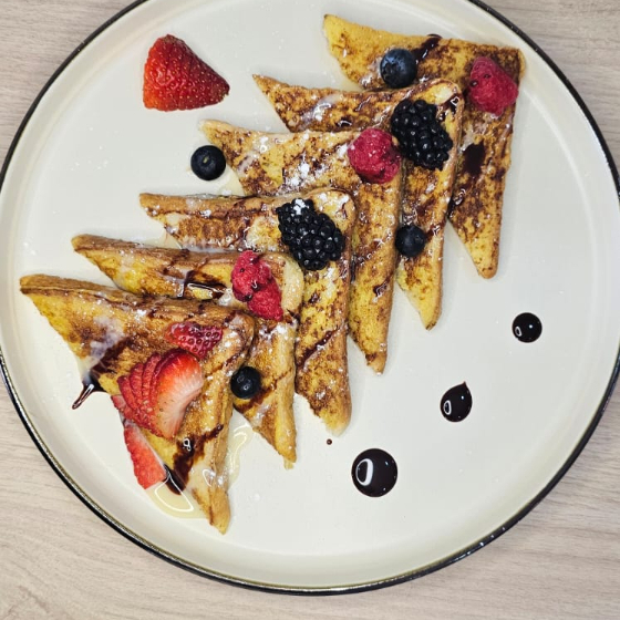 Tres piezas de pan francés dulce con mantequilla y mermelelada o miel de maple a elegir acompañado de frutas frescas.