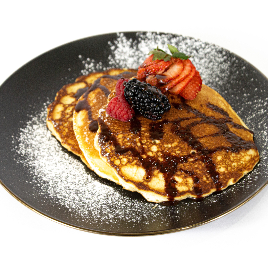 Tres piezas de hot cakes con mantequilla y mermelada o miel de maple a elegir acompañado de frutas frescas.