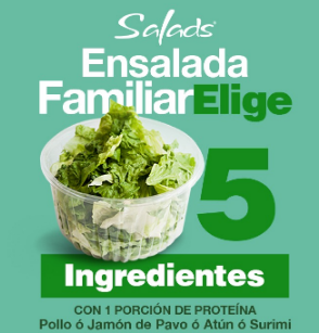 Dos porciones de proteína, cinco ingredientes de la barra, aderezo y croutons o galleta salada.