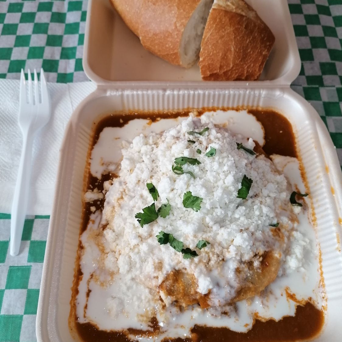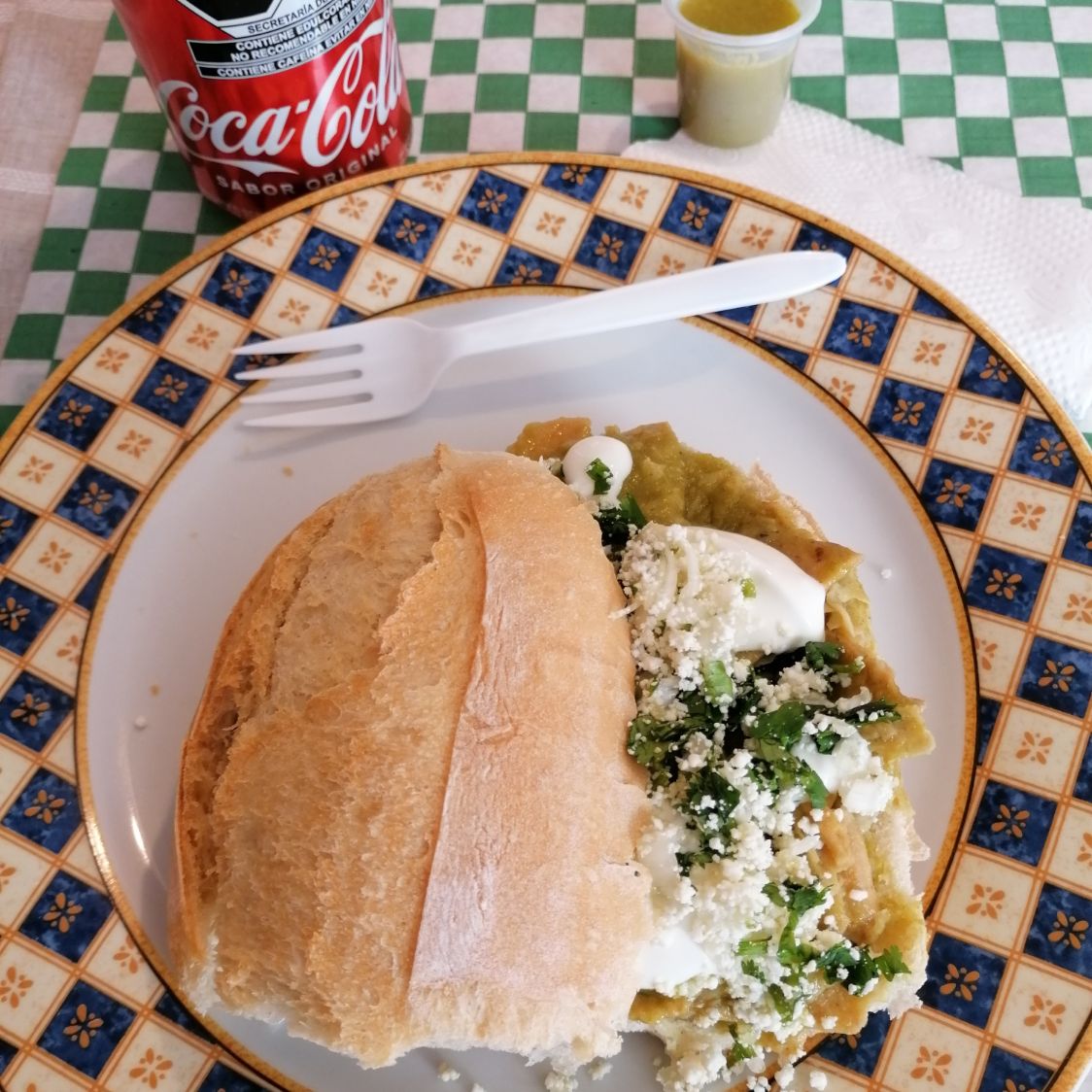 Torta de chilaquiles en salsa verde, queso, crema, cilantro, cebolla.
