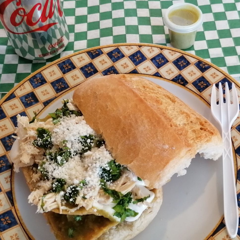 Torta de chilaquiles en salsa verde, pollo desmenuzado, queso, crema, cilantro, cebolla.