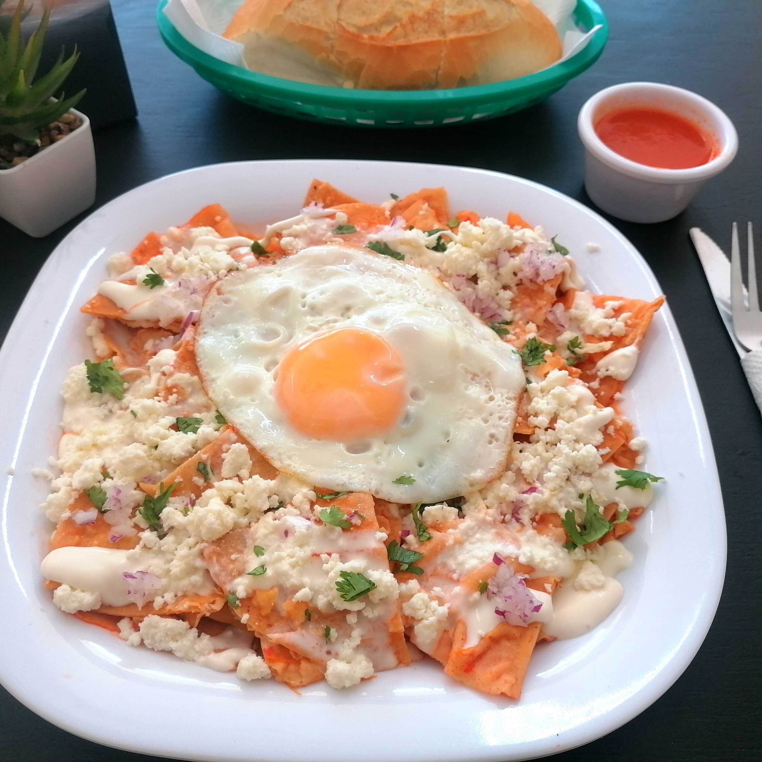 Totopos, huevo estrellado, queso, crema, cilantro, cebolla.