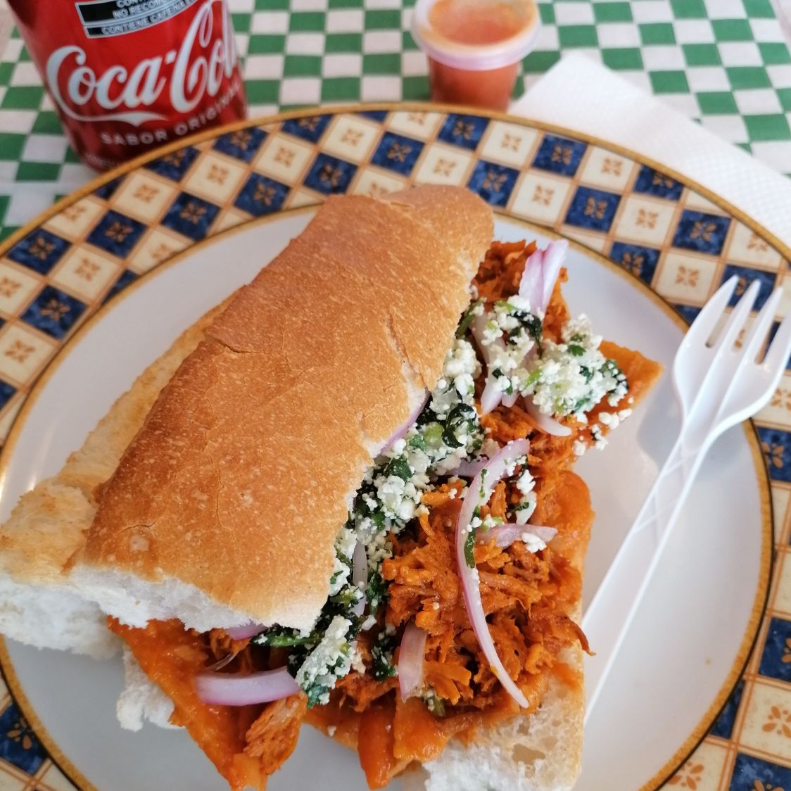 Deliciosa torta de chilaquil rojo, cochinita pibil, frijoles, queso, crema, cilantro, cebolla morada.