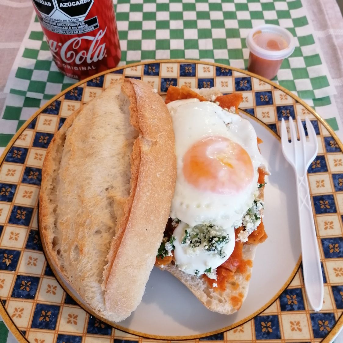 Torta de chilaquiles en salsa roja, huevo estrellado, queso, crema, cilantro, cebolla.