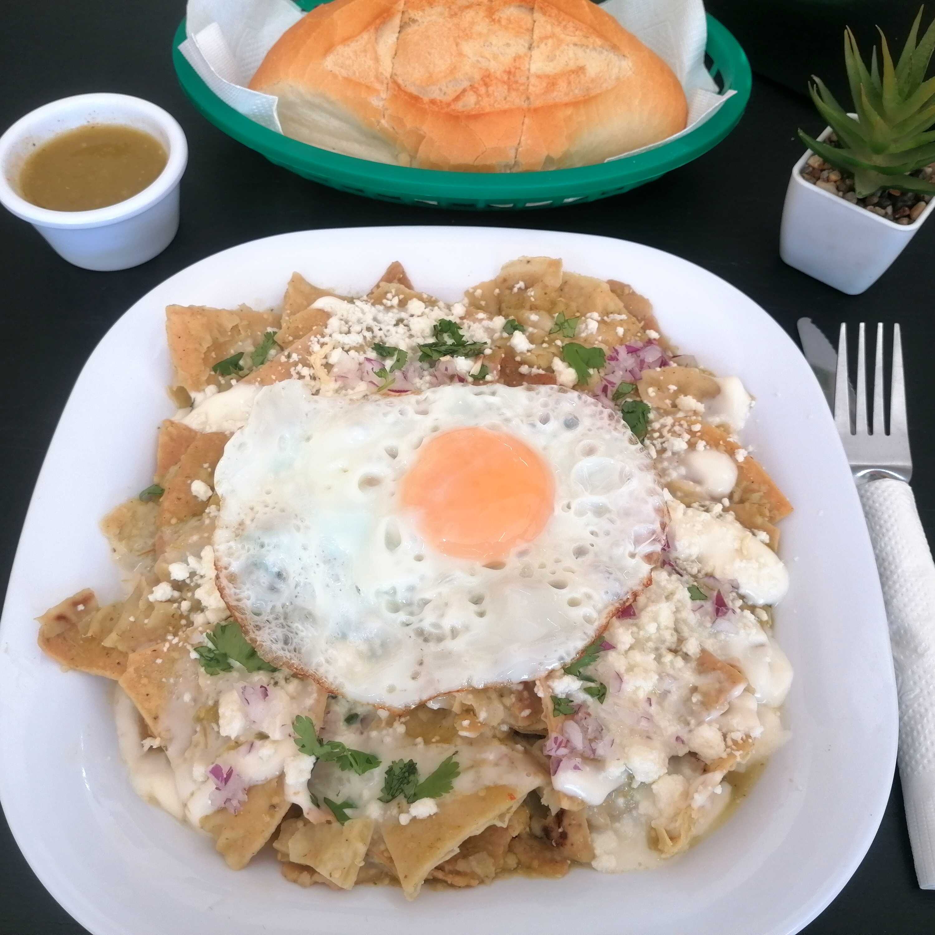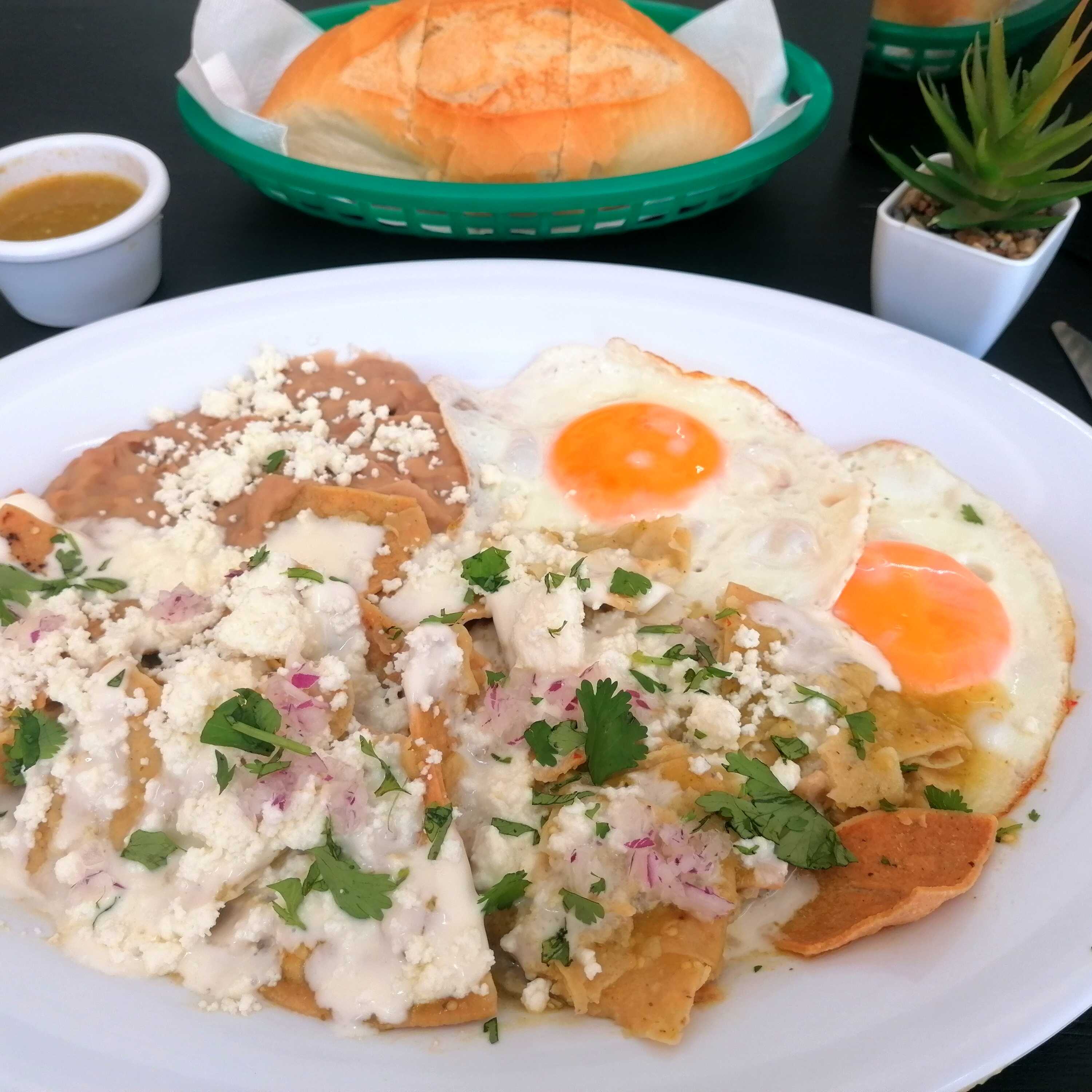 Totopos, huevo estrelledo, queso, crema, cilantro, cebolla.