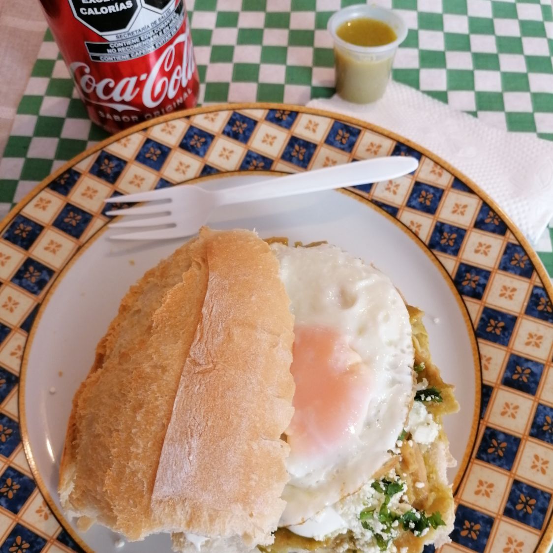 Torta de chilaquil en salsa verde, huevo estrellado, queso, crema, cilantro, cebolla.