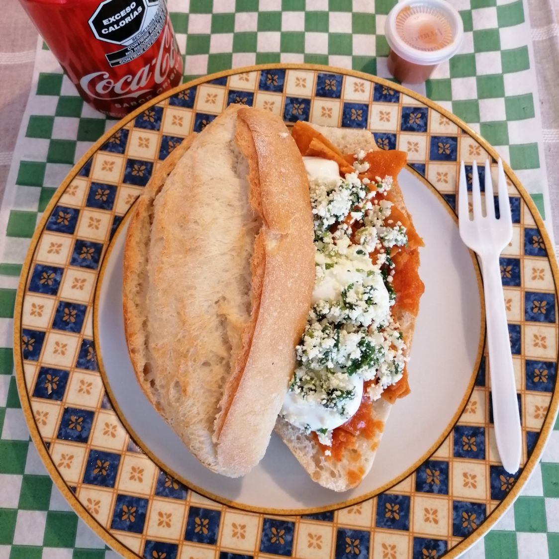 Torta de chilaquil en salsa roja, queso, crema, cilantro, cebolla.