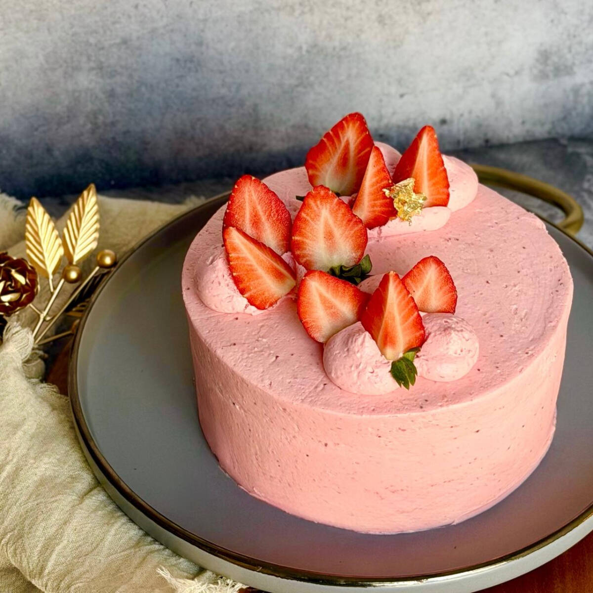 Bizcocho suave y húmedo a base de fresa natural y mantequilla, relleno de compota de fresa, betún de queso crema y fresas liofilizadas, decorado con fresas frescas.