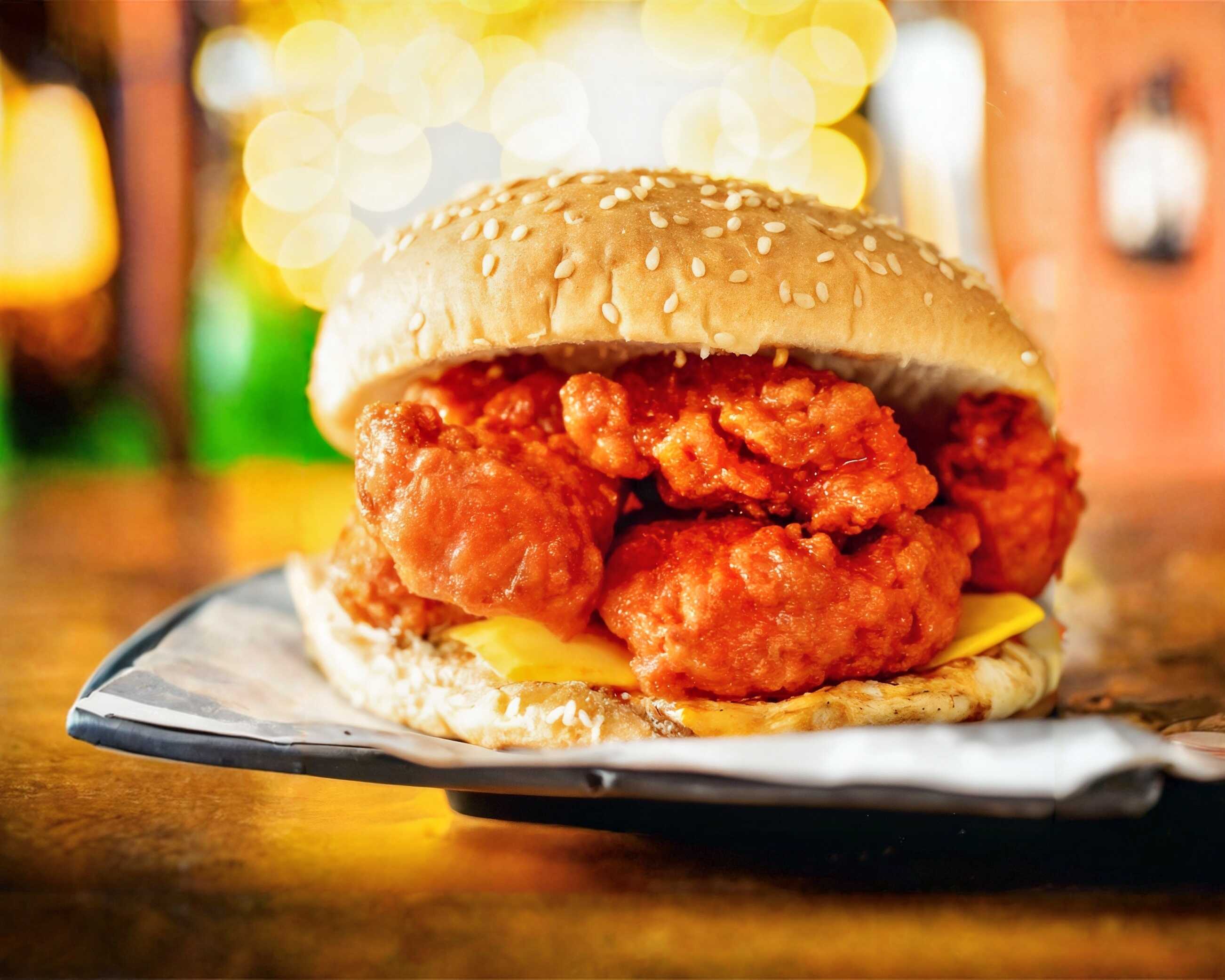 200 g De carne de res, queso amarillo, lechuga, jitomate, cebolla, aros de cebolla, aderezo BBQ, acompañada de 130 g de papas a la francesa con un dip de cátsup.
