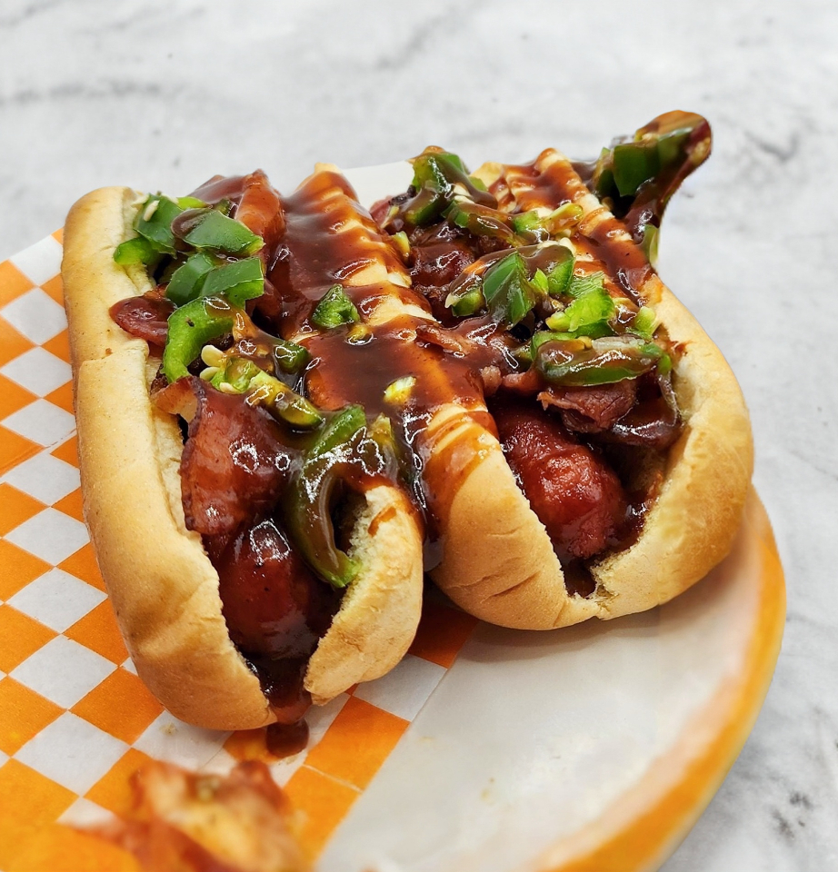 Tradicional Hot dog, tocino, salchicha, pan y verduras.