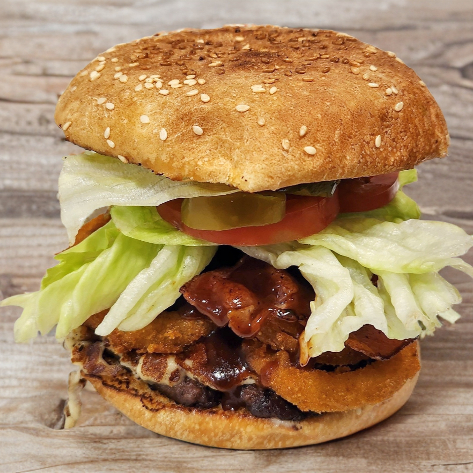 Carne de Res, Aros de Cebolla, BBQ, Tocino y Verduras