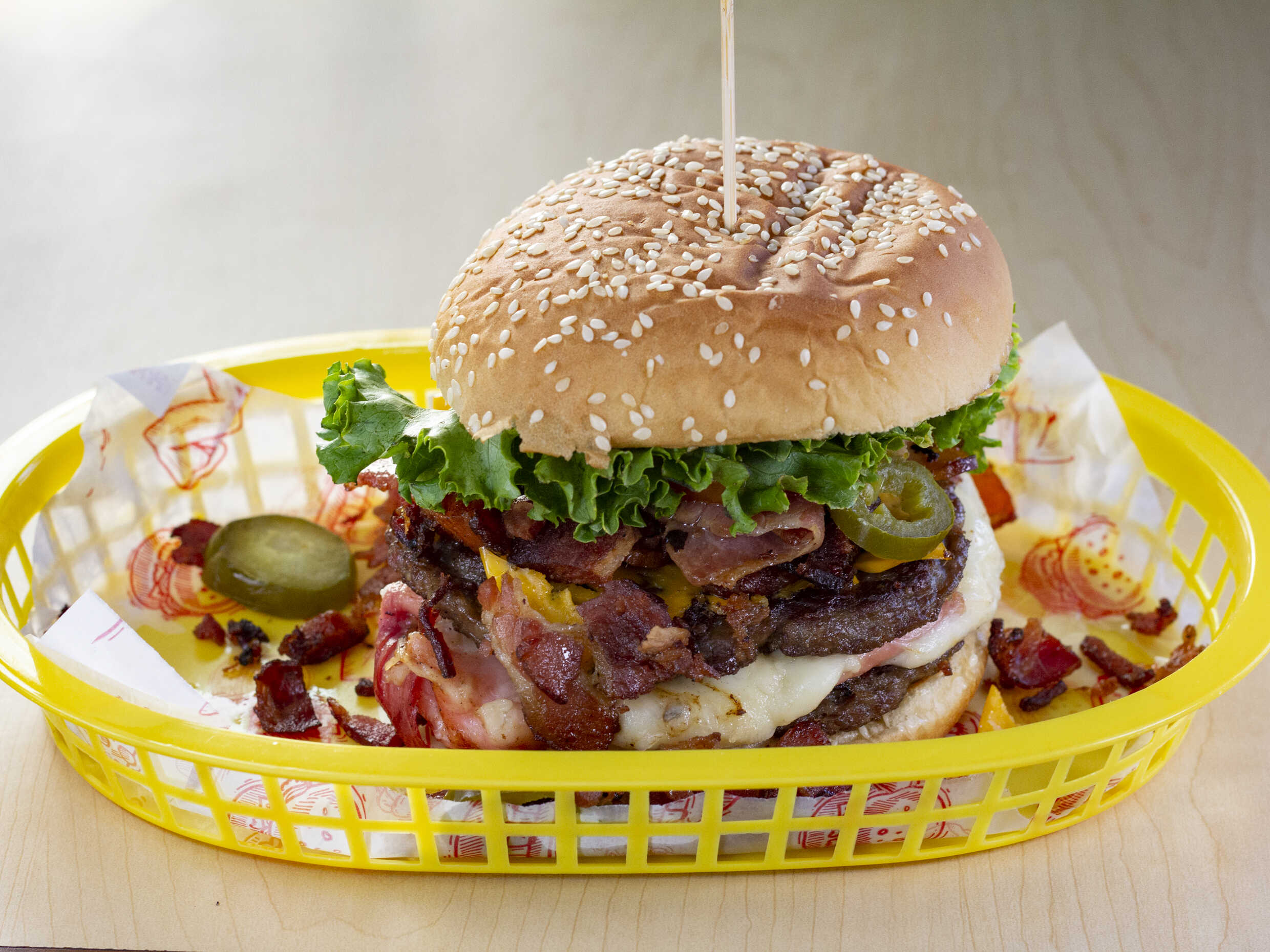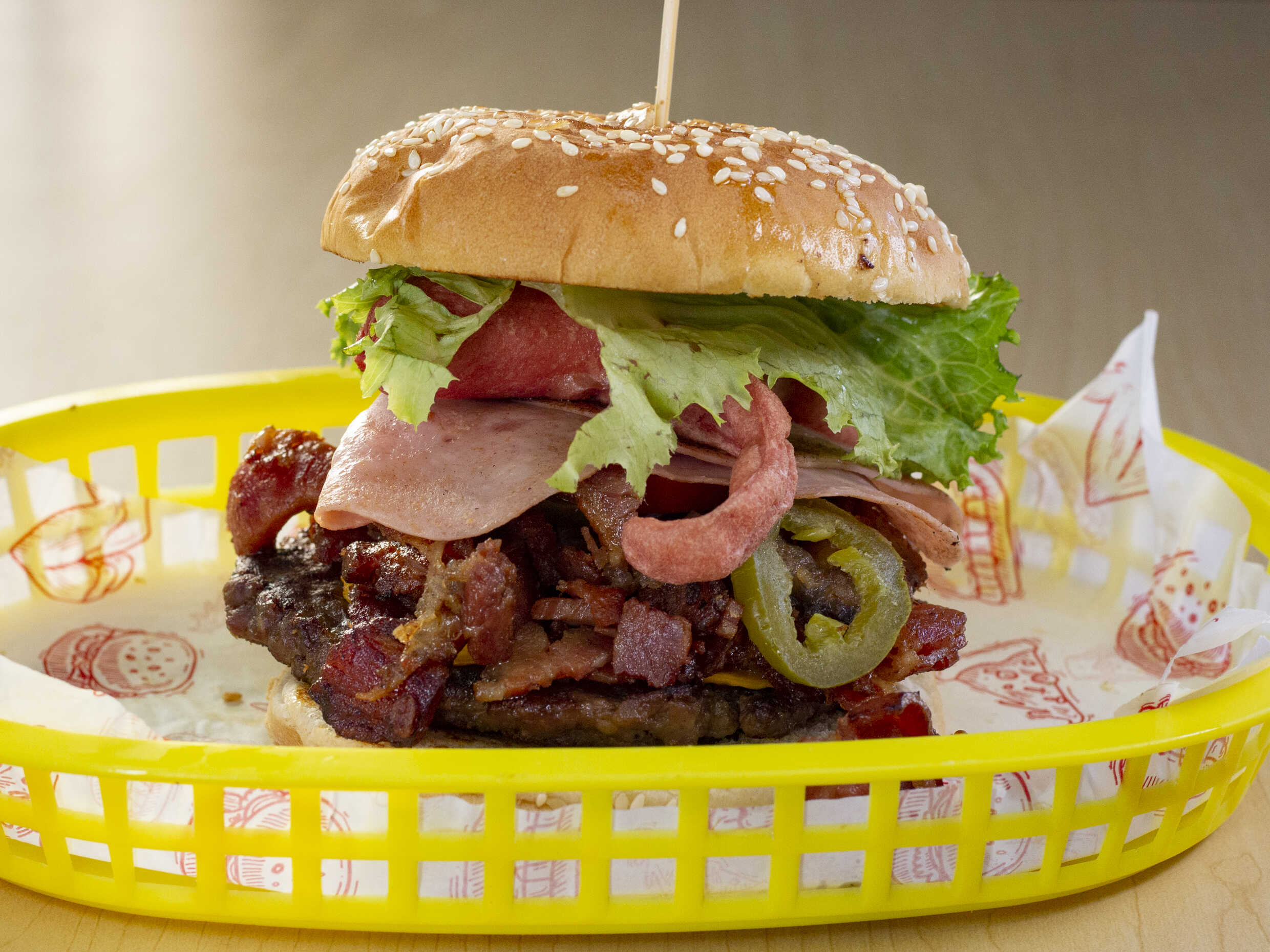 Doble carne, tocino, jamón, queso amarillo y asadero.
