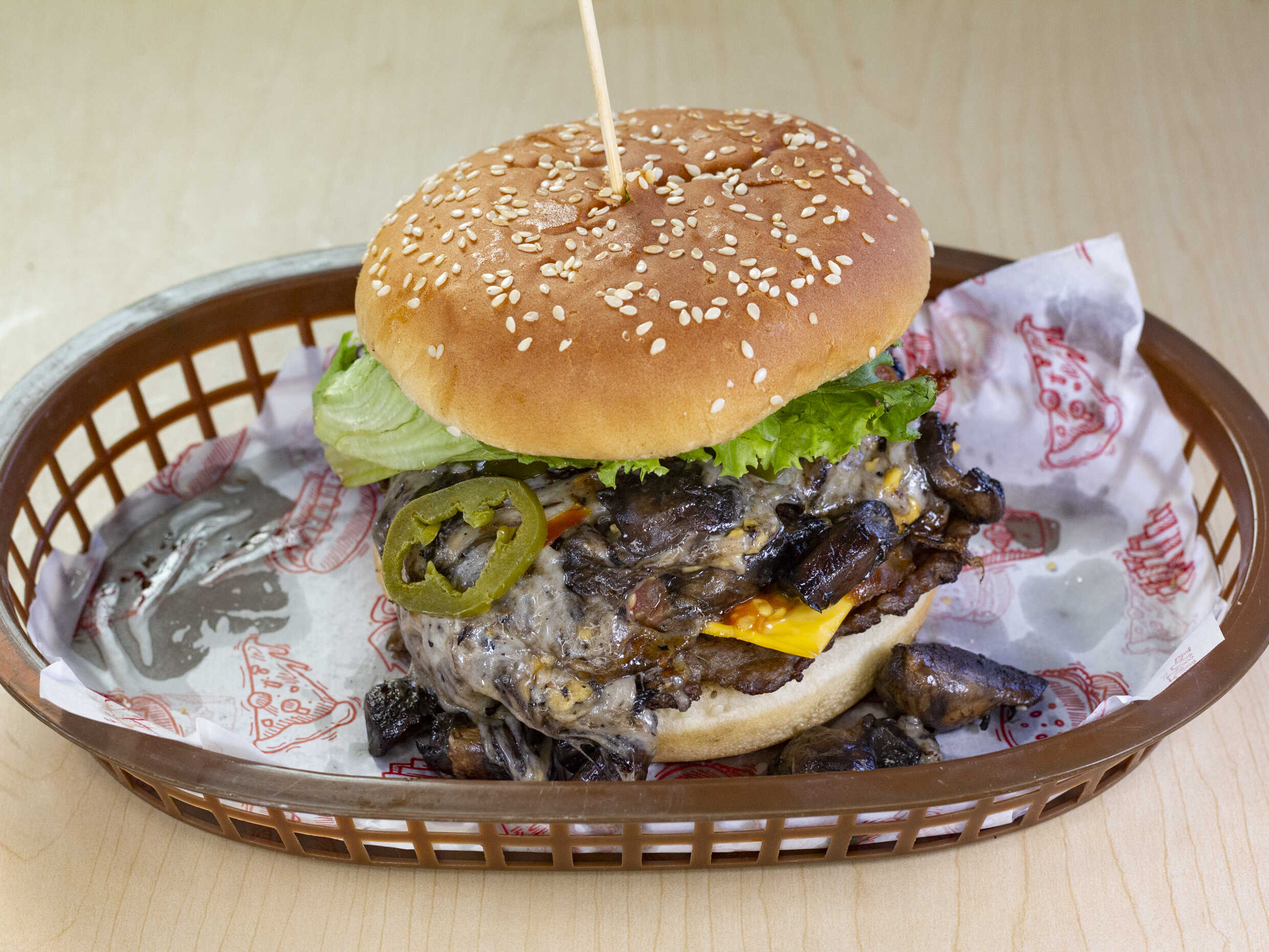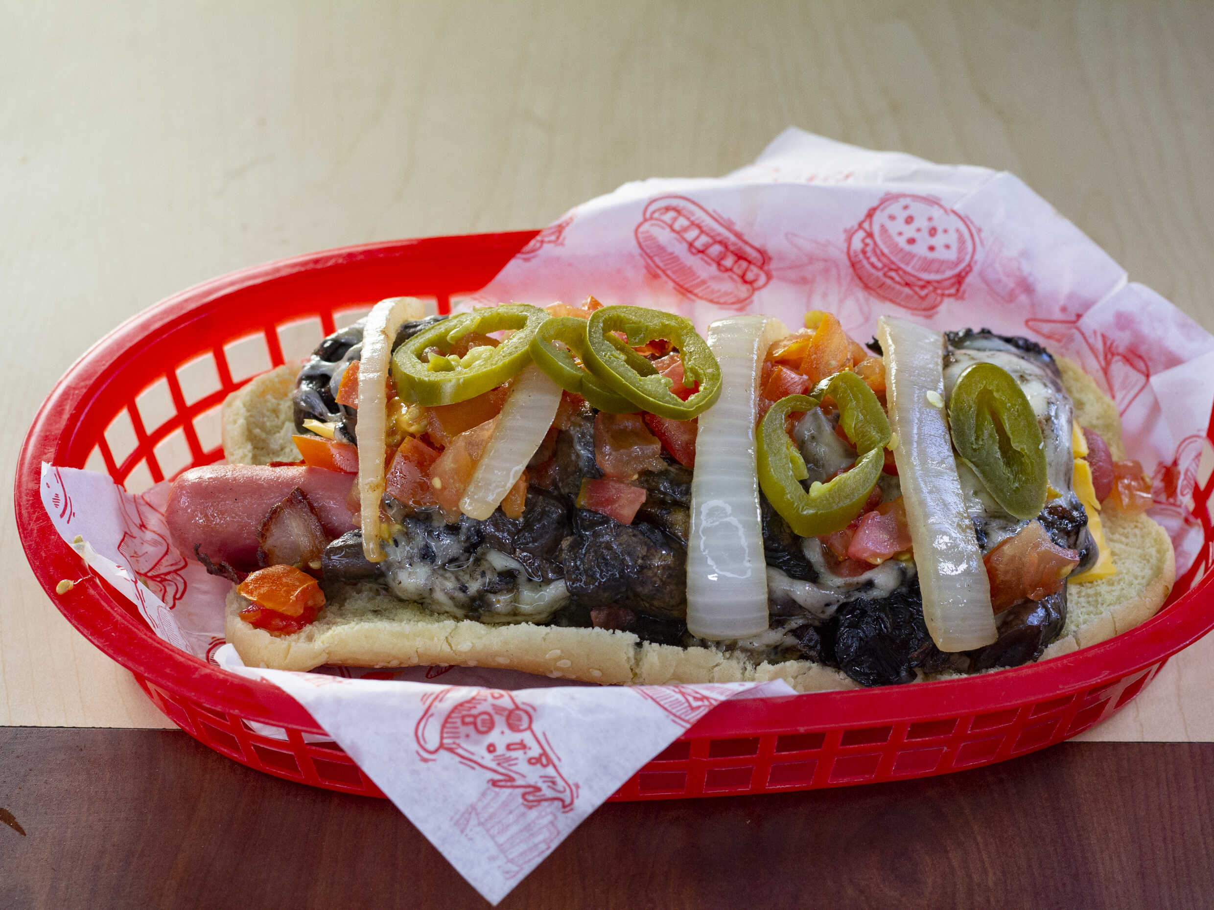 Doble salchicha con tocino, champiñones, queso asadero y queso amarillo.
