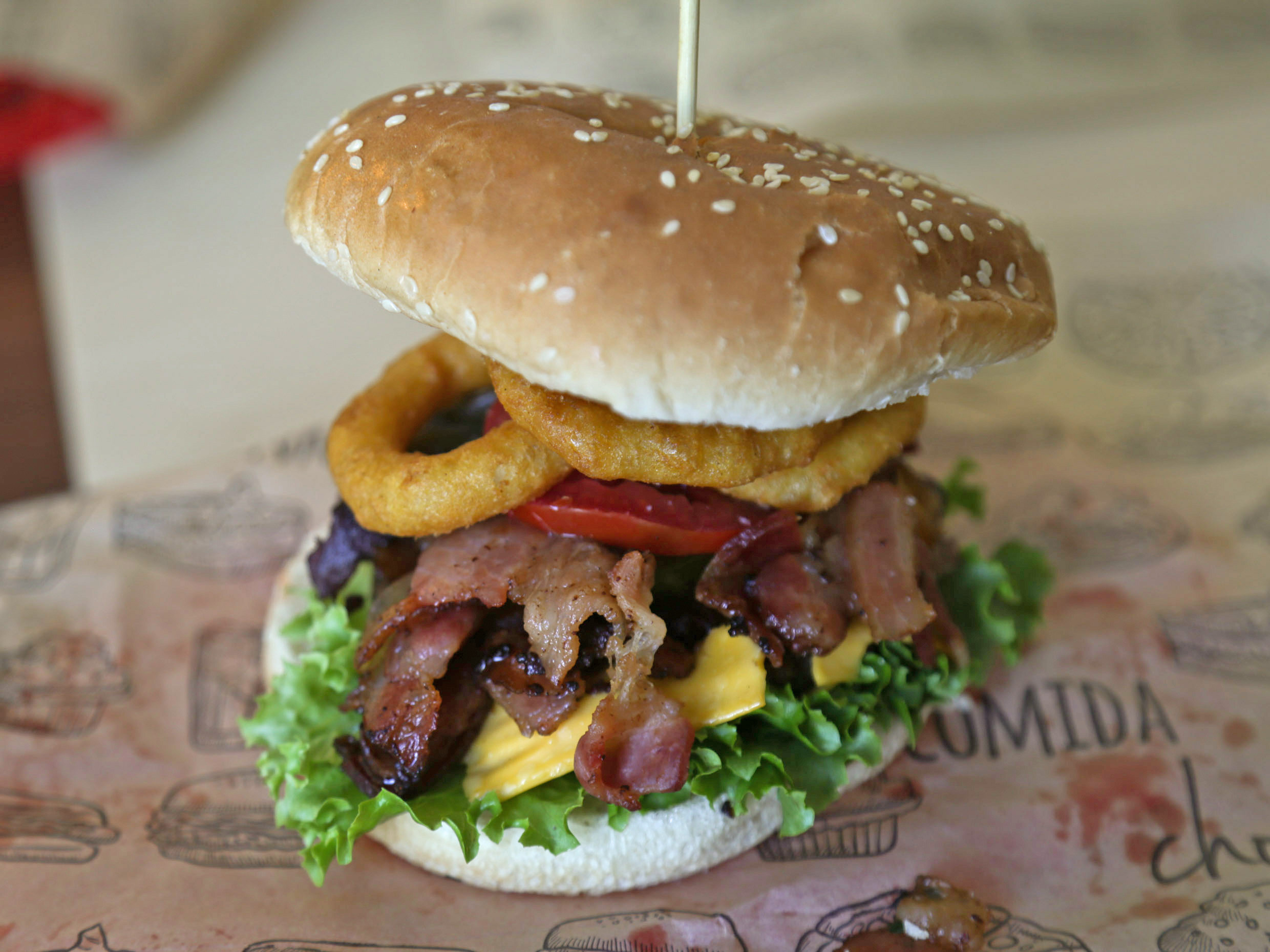 hamburguesa de tocino con 4 aros de cebolla