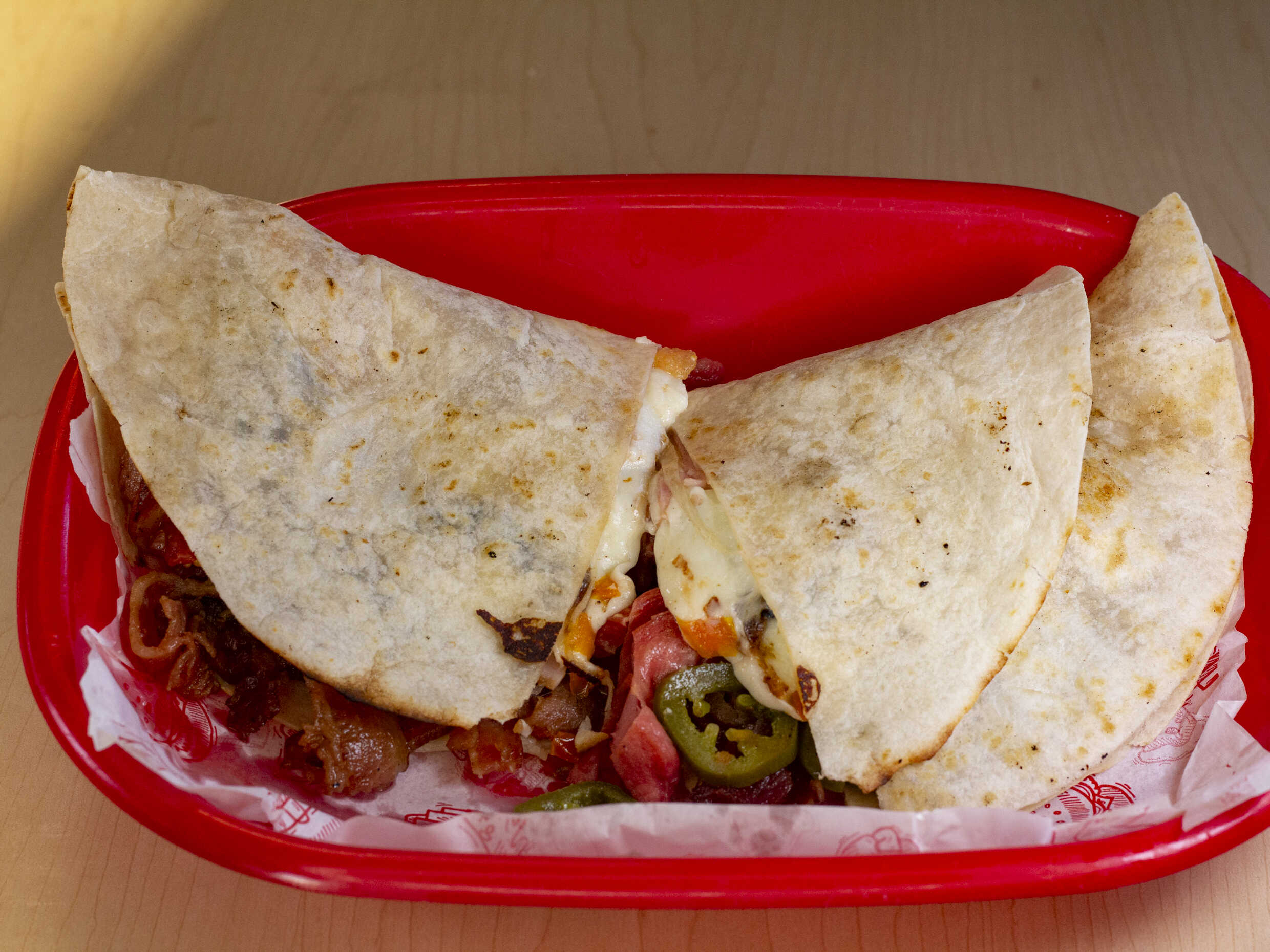 Tortilla de harina, jamón, tocino, salchicha, queso amarillo y asadero.