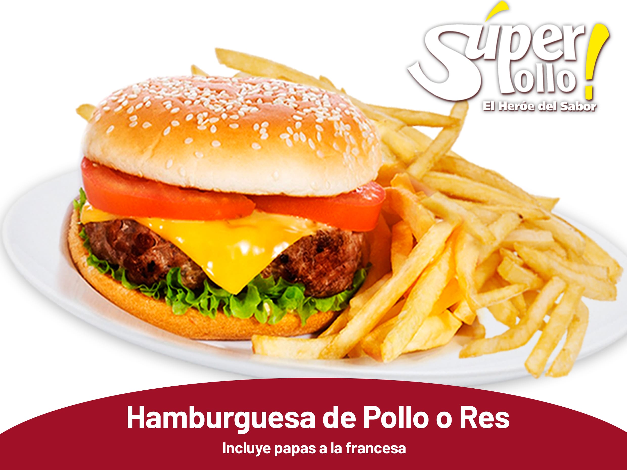 Deliciosa Hamburguesa Tradicional con jitomate, cebolla, lechuga, queso, aderezo en el pan acompañado de papas Francesa
