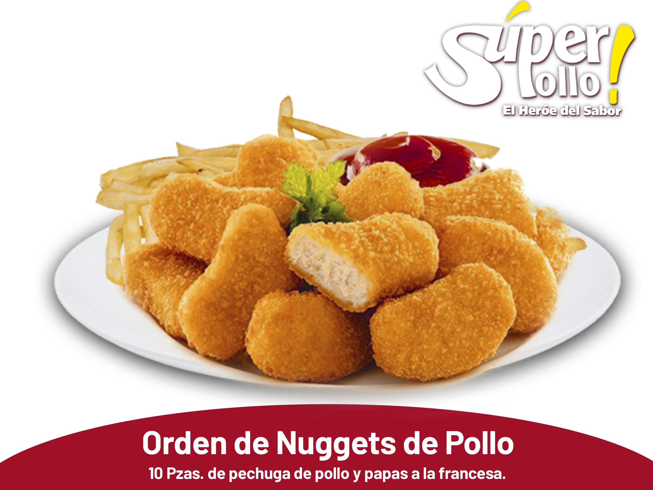 6 Pzas. de pechuga de pollo acompañados de papas a la francesa.