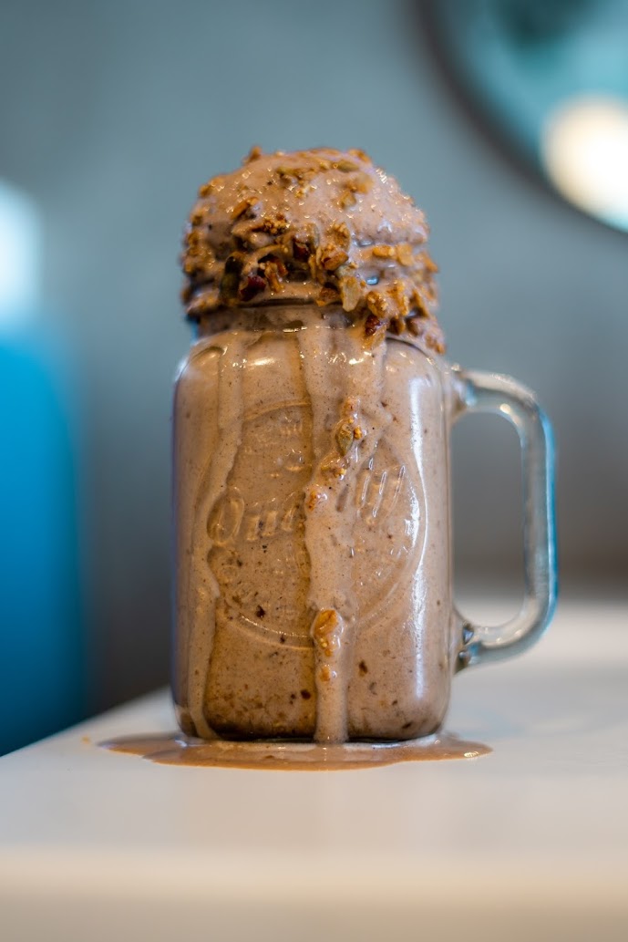 Mezcla: leche de almendras, plátano, cacao y crema de almendra. Topping: fresas, blueberries, granola healthy, coco y spread de avellana.