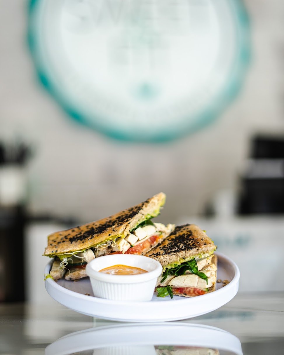 Pan de masa madre, pechuga de pavo, guacamole, queso mozzarella, pesto, jitomate, espinaca y semillas de girasol.
