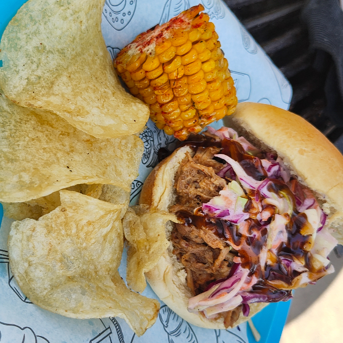 Delicioso Pulled Pork ahumado y cocinado lentamente, incluye elote amarillo asado y papas fritas. Delicioso