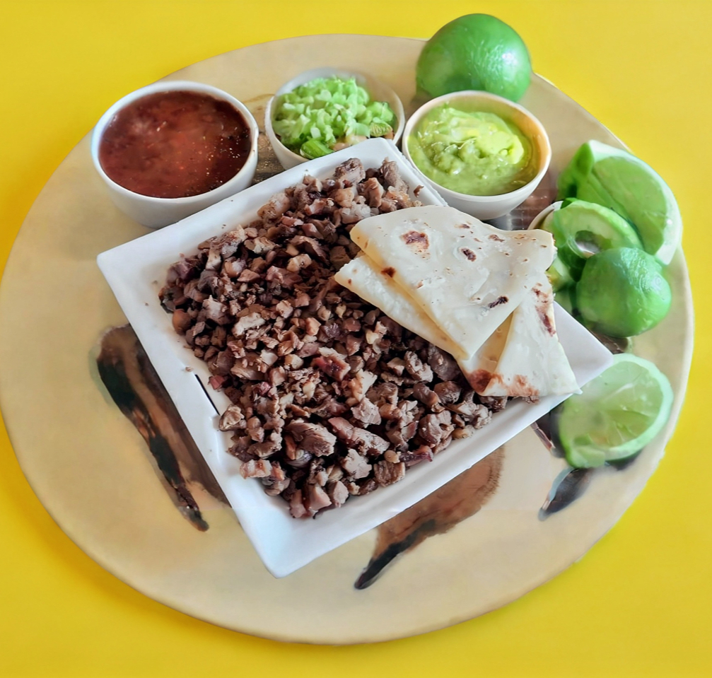 tortilla de harina,bistec,chorizo y chicharron acompañado de verdura y salsas