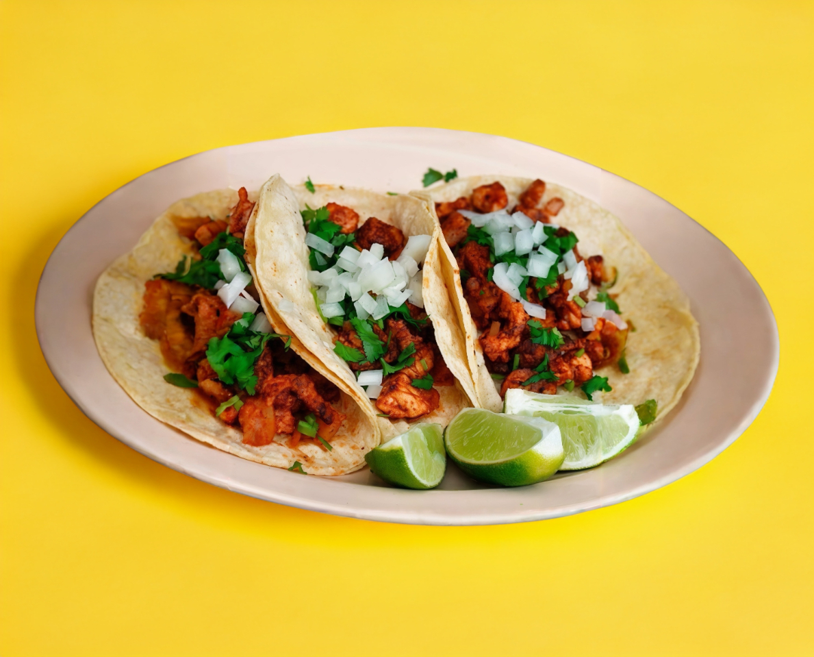 tortilla taquera de maiz , carne de cerdo adobada se acompaña con 3 tipos de salsa y verdura