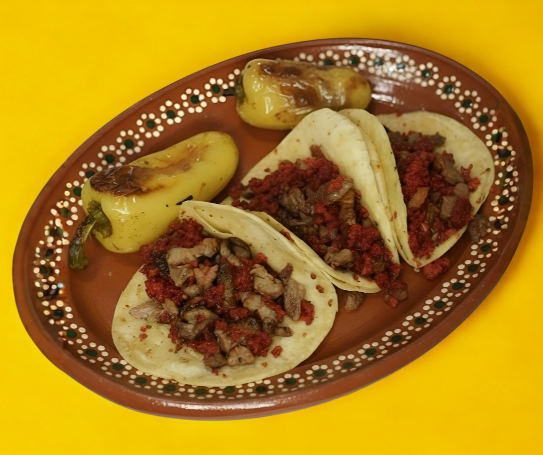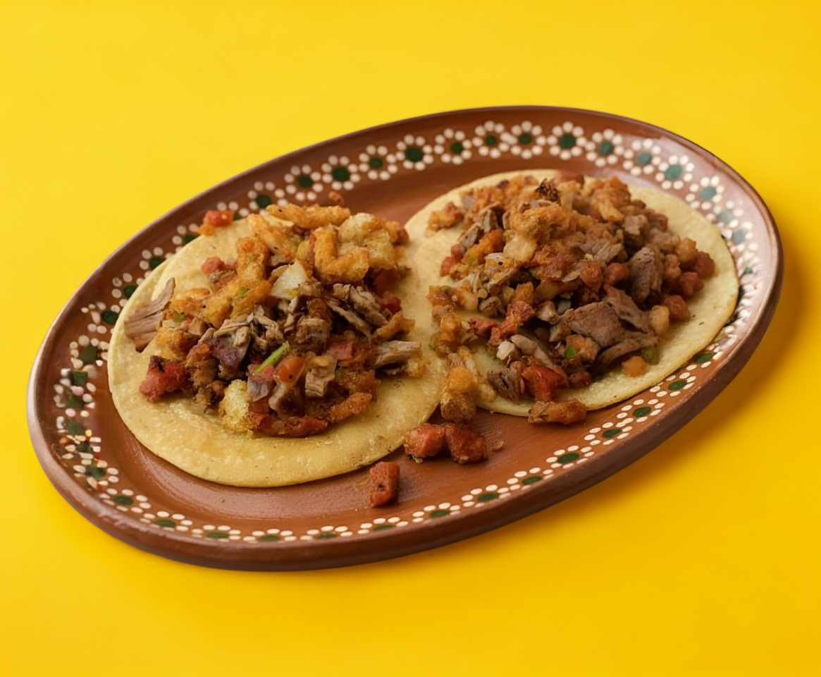 tortilla taquera de maiz ,bistec,chorizo de Villa Hidalgo y chicharron se acompaña con 3 diferentes salsa y su verdura