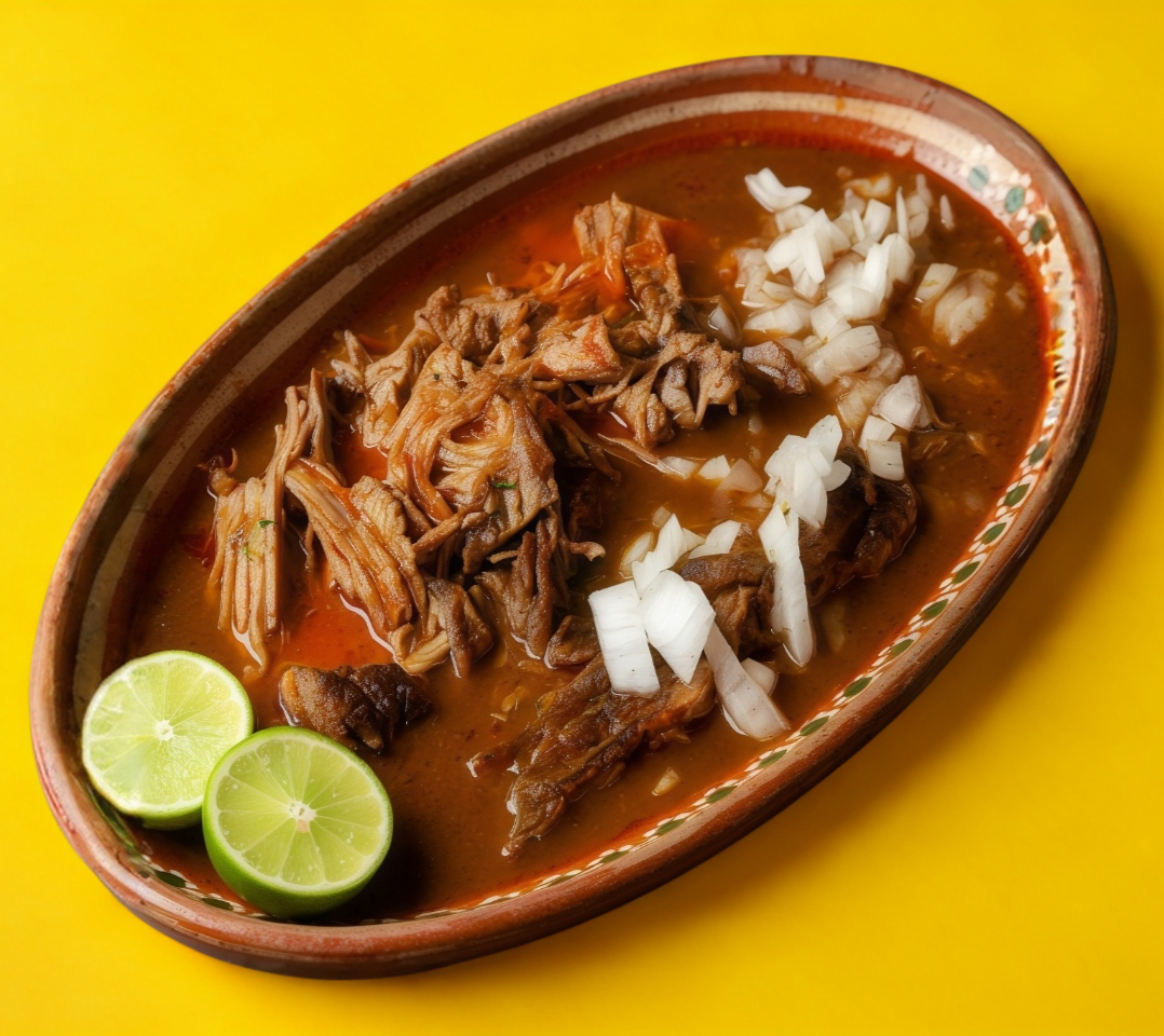 Artesanal carne tierna de vacuno enchilada coccion lenta que se deshace en la boca acompañada de sus tortillas salsa ,verdura y(consome GRATIS)