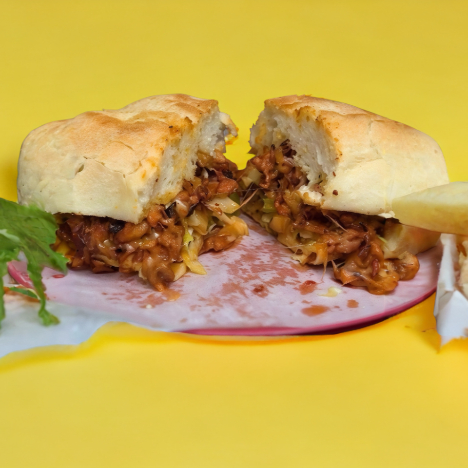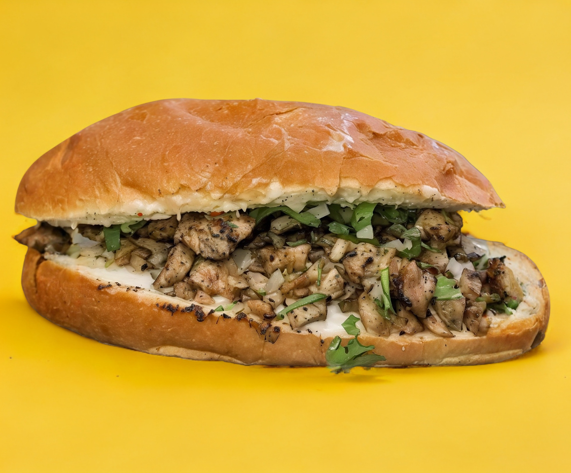 bolillo recien horneado de la chona ,carne de cerdo adobada con un toque de piña acompañada de salsas y verdura (quieres con queso tiene costo adicional)