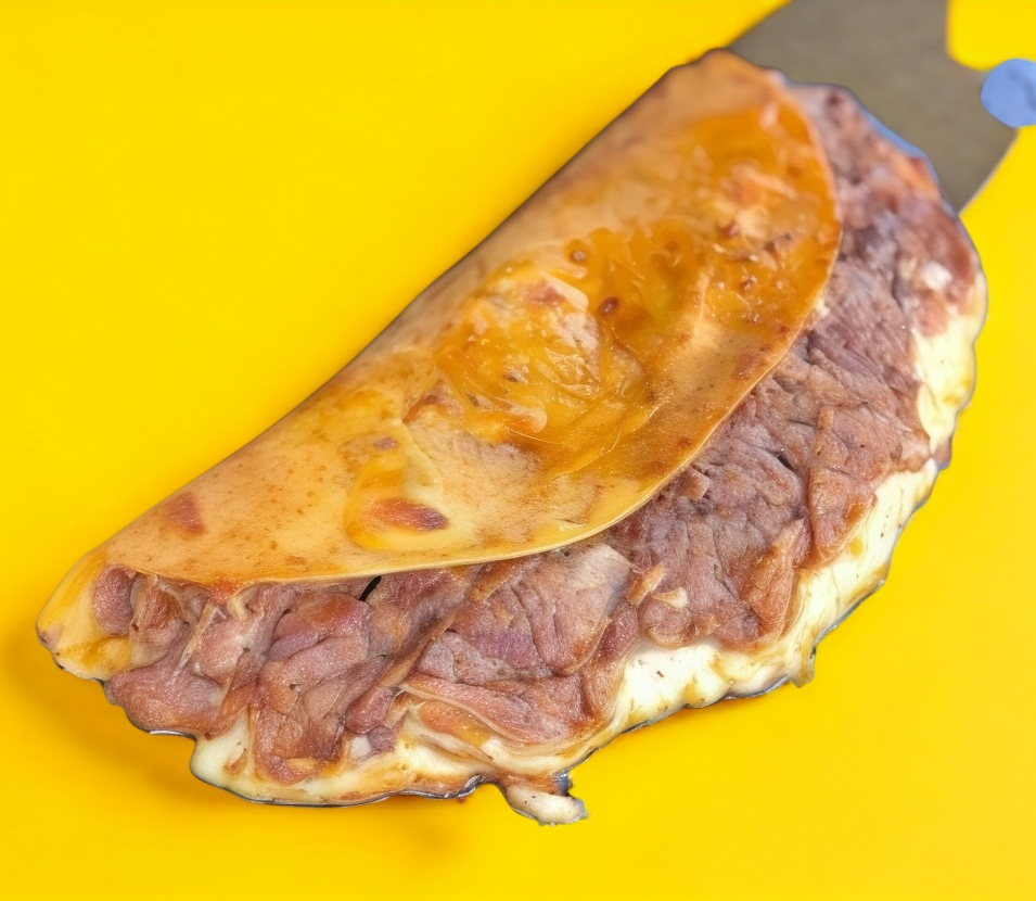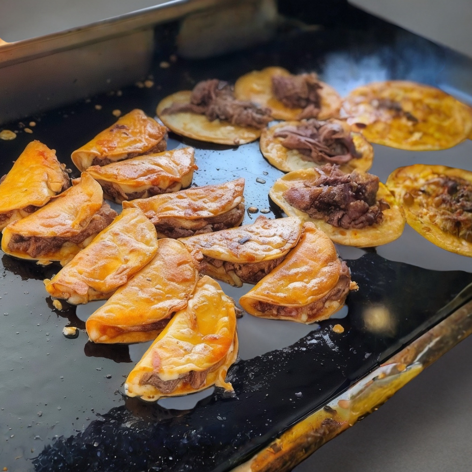 Tortilla De Maiz Dorada crujiente , birria adobada enchilada de vacuno , Queso Asadero fundido acompañdo De Salsa y Verdura (consome GRATIS)